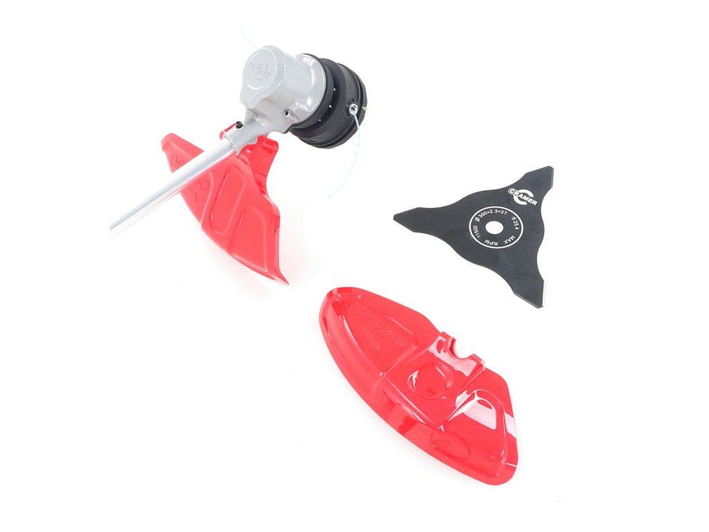 - Prémiová strunová žací hlava s nárazovým odvinutím má šířku sečení 45cm, pro rychlé vyžínání trávy, zatímco ocelový nůž křovinořezu o průměru 300mm si poradí i s odolnější zarostlou plochou