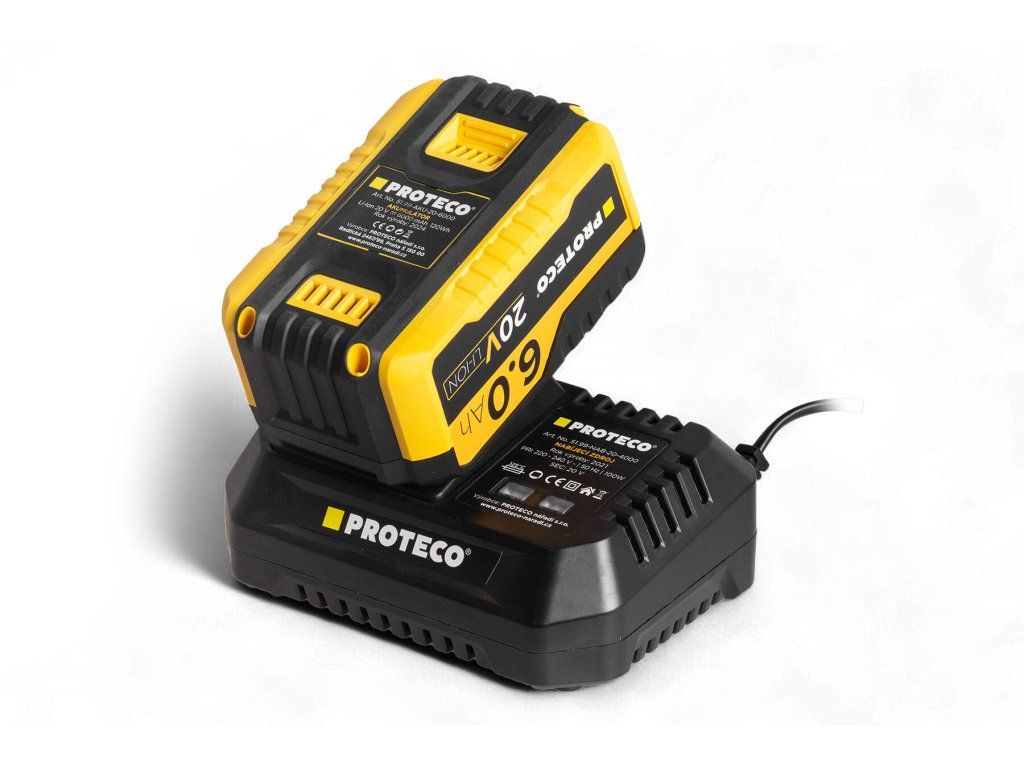 Akumulátor a nabíječka pro přístroje ze série PROTECO AKU PROGRAM. Li-Ion akumulátor - Jmenovité napětí: 20 V - Kapacita: 6 Ah (6000 mAh) Nabíječka - Příkon: 100 W - Pro akumulátory Li-Ion 20 V - Doba nabíjení cca 75 minut Výhody a charakteristické znaky: - Výkonný Li-Ion akumulátor s 3stupňovým ukazatelem stavu nabití - Nabíječka s LED ukazatelem nabití a automatickým vypnutím nabíjení - Protiskluzové pogumované nožičky u nabíječky - Možnost upevnění nabíječky na stěnu - Kompaktní se všemi přístroji PROTECO AKU PROGRAMDoplňkové parametry
