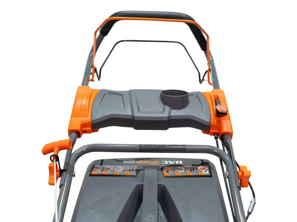 - Ergonomický skládací systém rukojeti a sběrného koše na trávu usnadňuje skladování nebo přepravu sekačky.