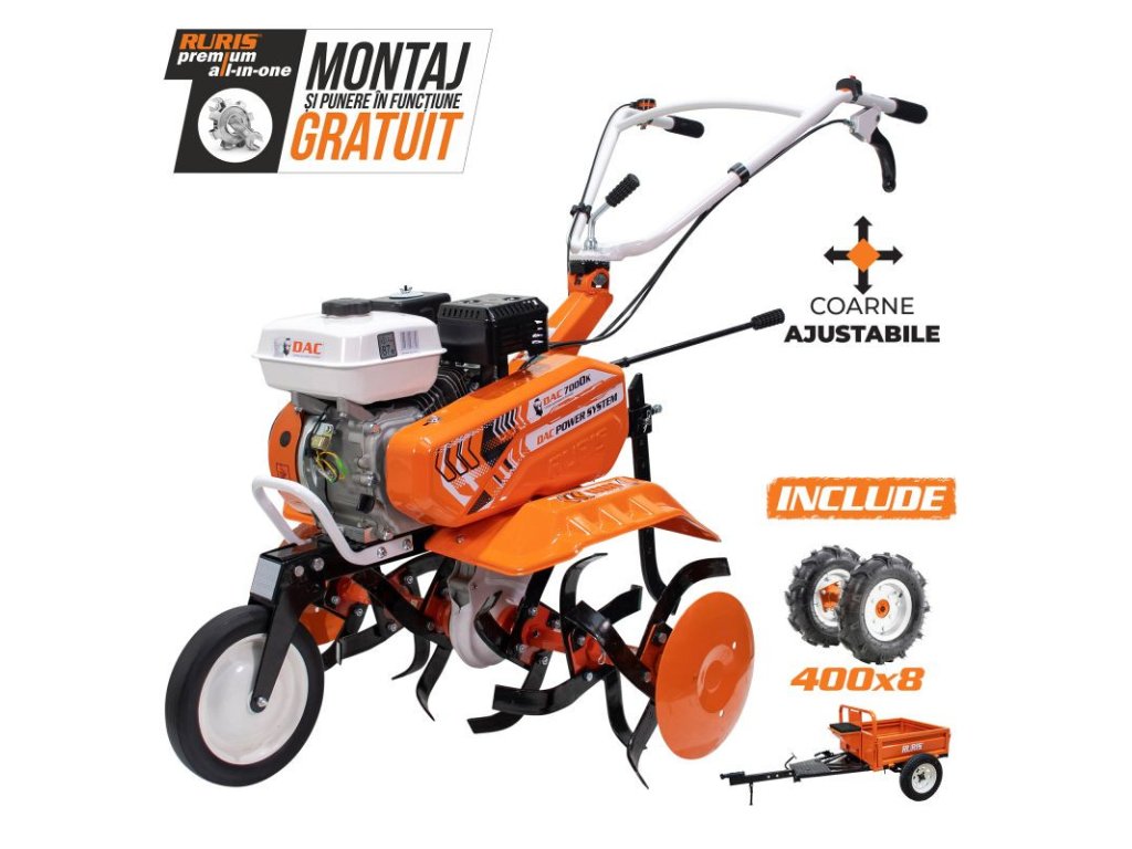 Poloprofesionální kultivátor RURIS DAC 7000K úspěšně kombinuje výkon a účinnost při kypření půdy ve sklenících nebo zahradách. Za méně než 30 minut je plocha o rozloze 500 m2 připravena k setí nebo sázení. Může být použit v zahradách i na středně velkých rolích, jelikož je vybaven výkonným motorem o výkonu 7 HP. Aby bylo možné efektivně pracovat i v úzkých prostorách, na konci řádků ve sklenících, může se kultivátor RURIS DAC 7000K otáčet ovládáním převodovky v opačném směru.