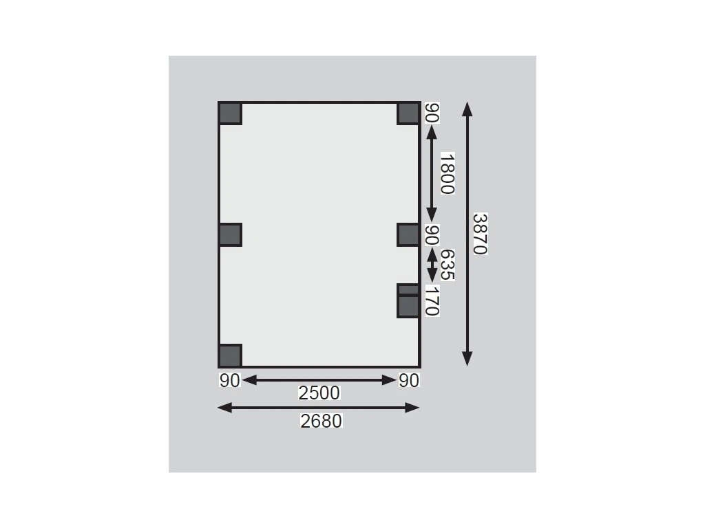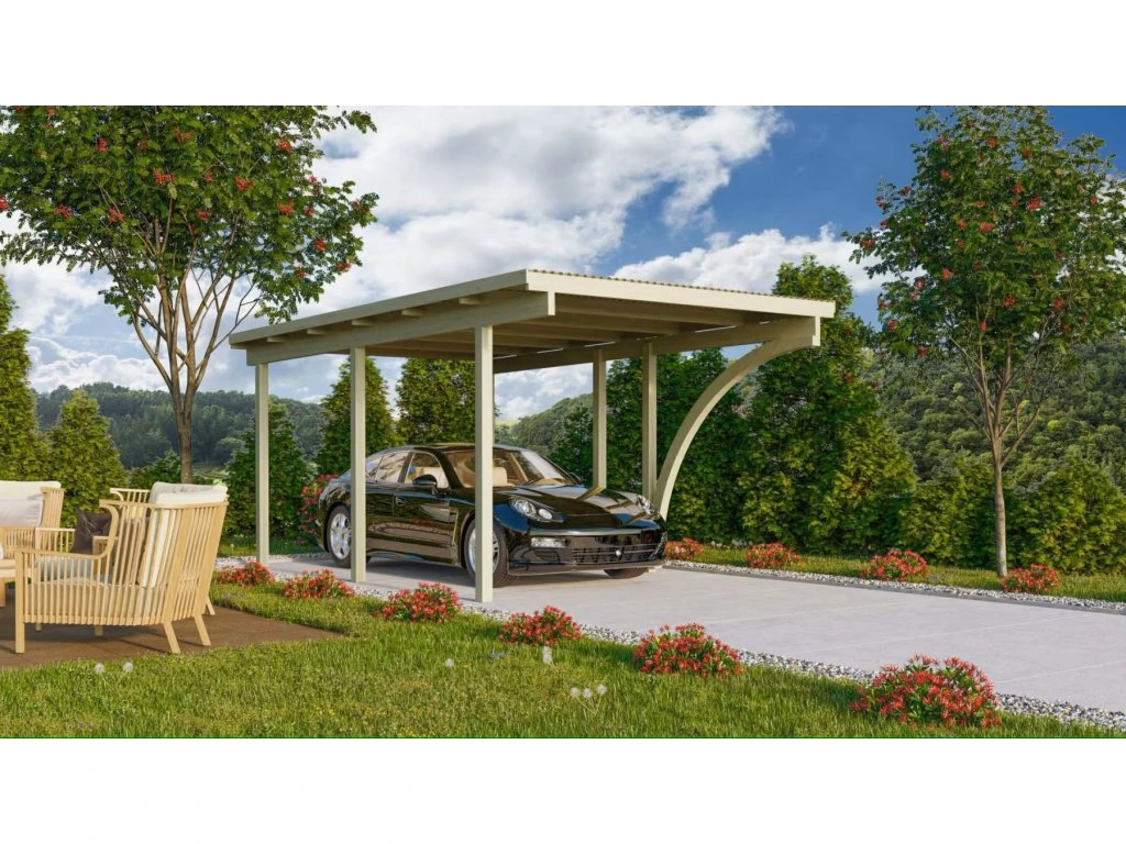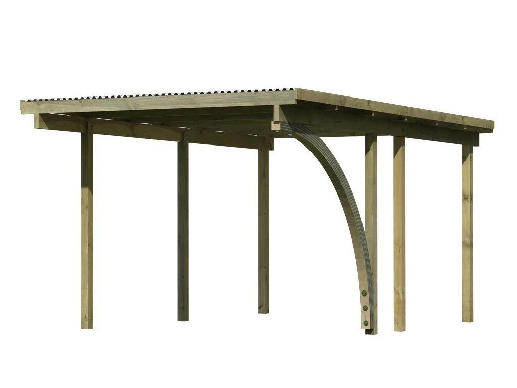 Přístřešek má obdélníkový tvar a svými rozměry vyhovuje většině modelů vozidel běžných na českém trhu. Celková zastřešená plocha je 3,04 x 4,90 m. Průjezdná výška je 206 cm. Střechu podpírá šest dřevěných sloupků 9 x 9 cm. Konstrukce přístřešku je tlakově impregnována a je tak dobře chráněna proti dřevokazným houbám i hmyzu, ale i proti nepříznivým povětrnostním podmínkám. Impregnace je zdravotně nezávadná a naprosto bezpečná. Vzhledem k velkým plochám střechy a zatížení větrem je nutné připevnit přístřešek k zemi pomocí odpovídajících zemních kotev (nejsou obsahem dodávky - lze dokoupit jako příplatkové příslušenství).