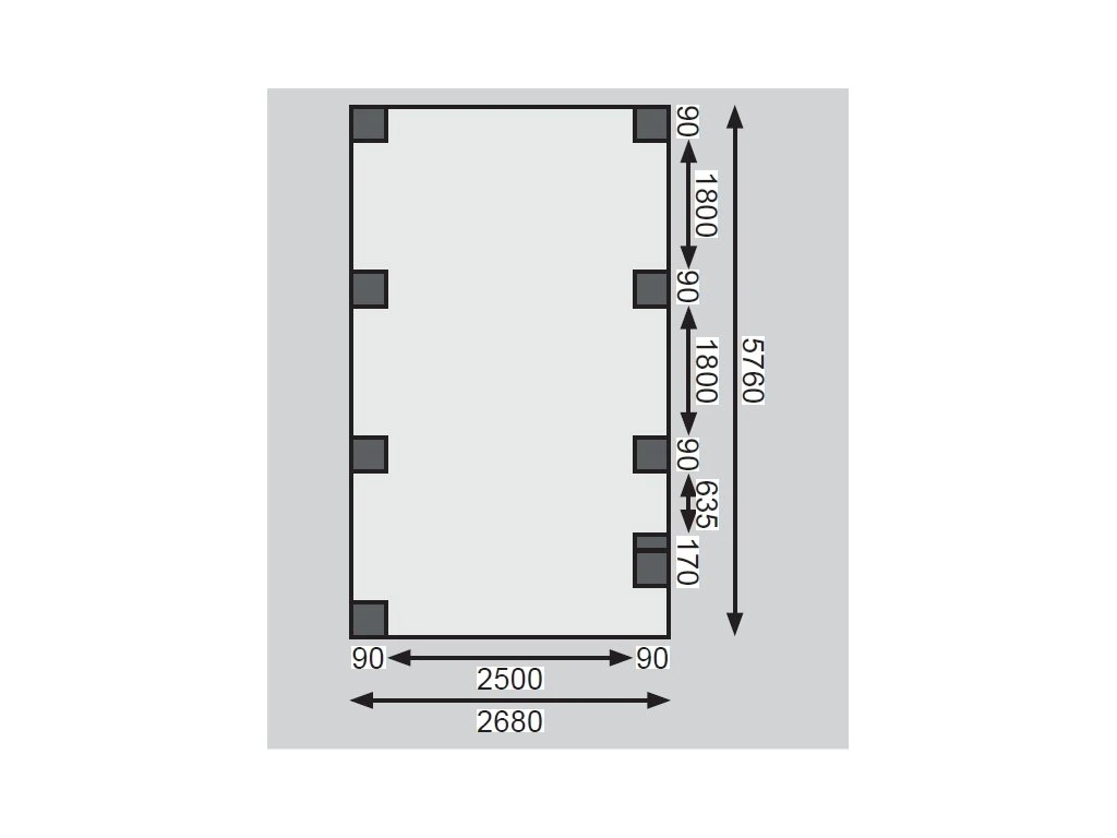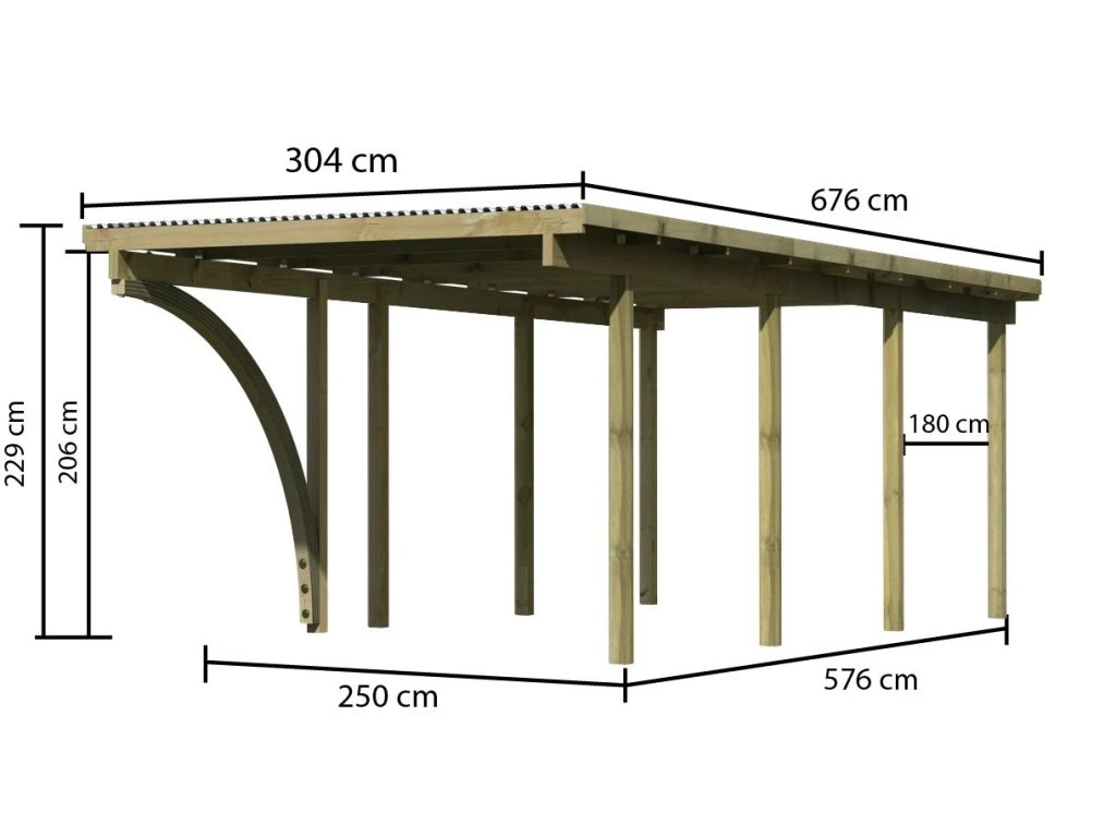 Přístřešek má obdélníkový tvar a svými rozměry vyhovuje většině modelů vozidel běžných na českém trhu. Celková zastřešená plocha je 3,04 x 6,76 m. Průjezdná výška je 206 cm. Střechu podpírá osm dřevěných sloupků 9 x 9 cm. Konstrukce přístřešku je tlakově impregnována a je tak dobře chráněna proti dřevokazným houbám i hmyzu, ale i proti nepříznivým povětrnostním podmínkám. Impregnace je zdravotně nezávadná a naprosto bezpečná. Vzhledem k velkým plochám střechy a zatížení větrem je nutné připevnit přístřešek k zemi pomocí odpovídajících zemních kotev (nejsou obsahem dodávky - lze dokoupit jako příplatkové příslušenství).