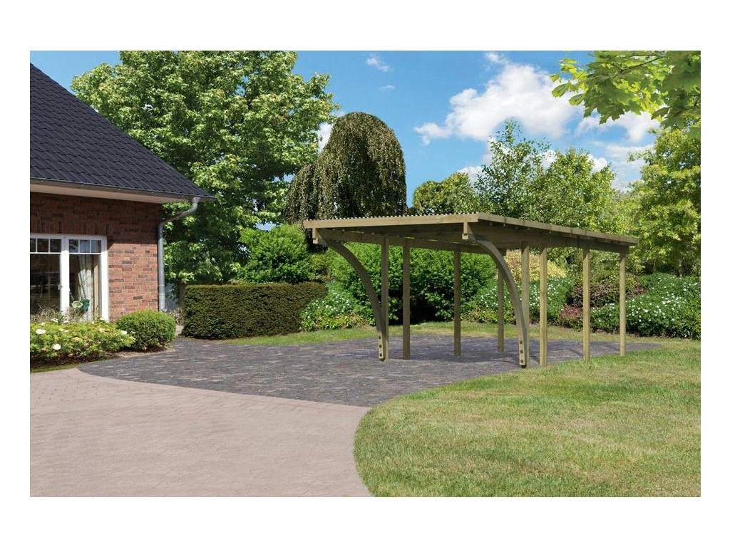 Přístřešek na auto - obdélníkový tvar a svými rozměry vyhovuje většině modelů vozidel běžných na českém trhu. Celková zastřešená plocha je 3,04 x 6,76 m. Průjezdná výška je 206 cm. Střechu podpírá osm dřevěných sloupků 9 x 9 cm. Konstrukce přístřešku je tlakově impregnována a je tak dobře chráněna proti dřevokazným houbám i hmyzu, ale i proti nepříznivým povětrnostním podmínkám. Impregnace je zdravotně nezávadná a naprosto bezpečná. Vzhledem k velkým plochám střechy a zatížení větrem je nutné připevnit přístřešek k zemi pomocí odpovídajících zemních kotev (nejsou obsahem dodávky - lze dokoupit jako příplatkové příslušenství).
