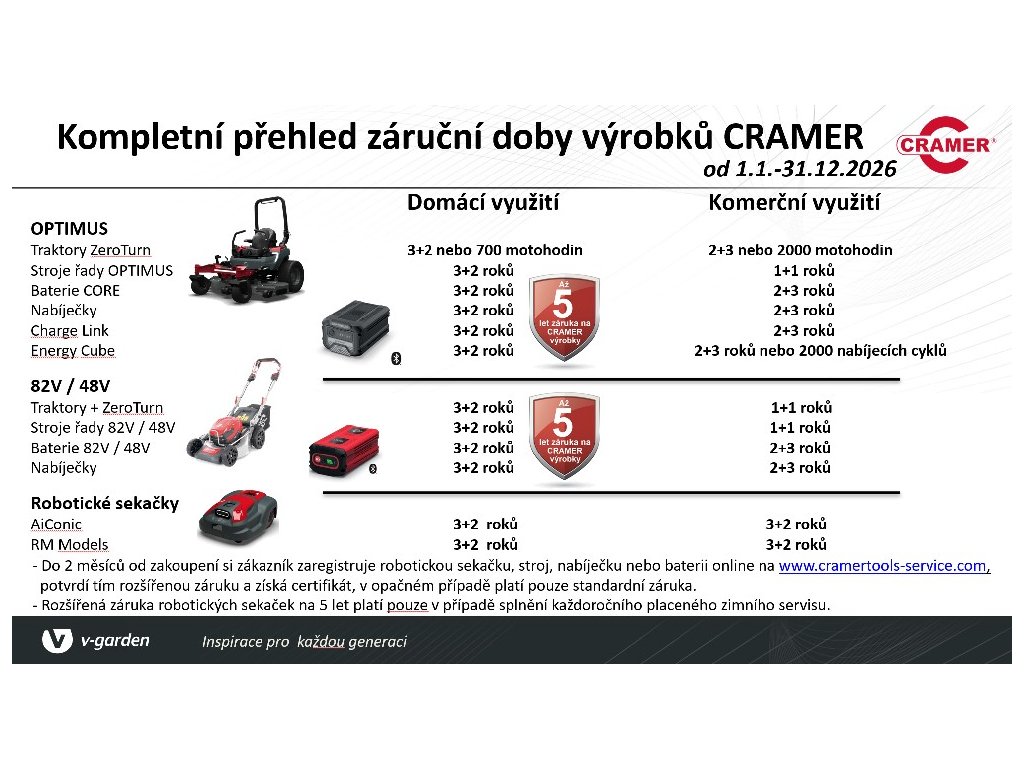 *Do 2 měsíců od zakoupení si zákazník zaregistruje stroj, nabíječku nebo baterii online na https://cramertools.com/en-cz/pages/product-registration a potvrdí tím rozšířenou záruku a získá certifikát, v opačném případě platí pouze standardní záruka.