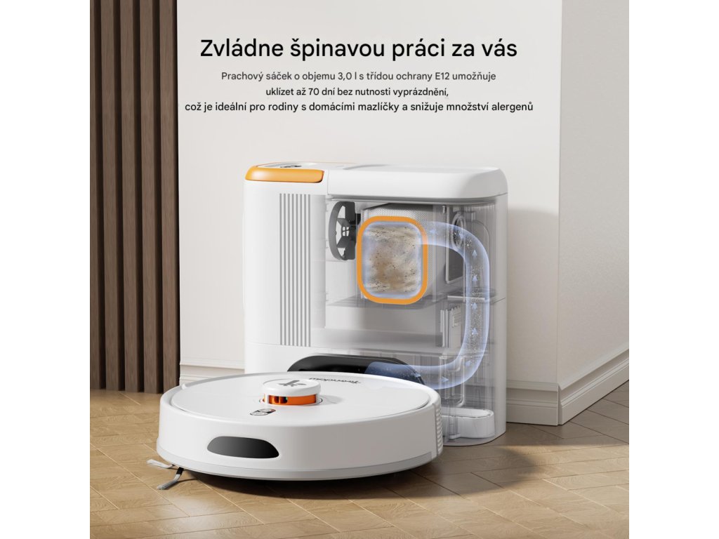 Velký prachový sáček o objemu 3 litry a funkce samočinného vyprazdňování umožňují robotu pracovat až 70 dní bez nutnosti vyprazdňování. To přináší obrovské pohodlí pro domácnosti s domácími mazlíčky, kde se zvířecí chlupy rychle hromadí, a výrazně zkracuje dobu údržby.