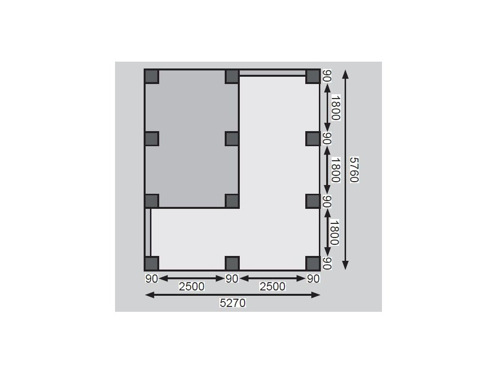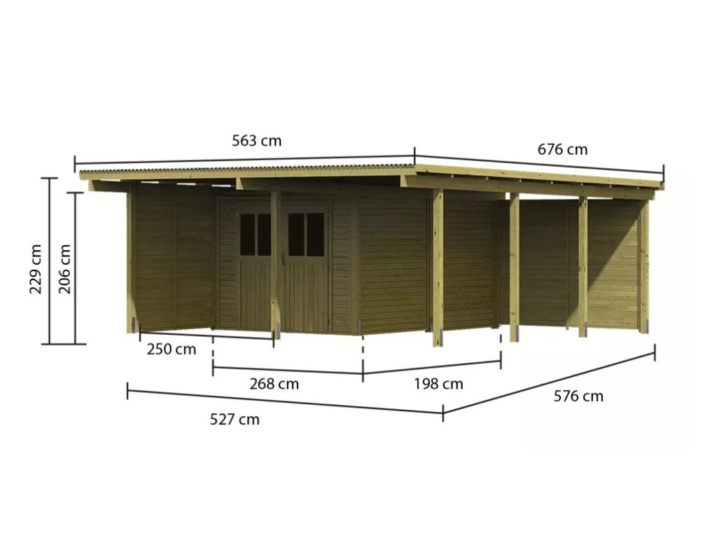 Přístřešek má obdélníkový tvar a svými rozměry vyhovuje většině modelů vozidel běžných na českém trhu. Celková zastřešená plocha je 5,63 x 6,76 m. Průjezdná výška je 206 cm. Střechu podpírá dvanáct dřevěných sloupků 9 x 9 cm. Konstrukce přístřešku je tlakově impregnována a je tak dobře chráněna proti dřevokazným houbám i hmyzu, ale i proti nepříznivým povětrnostním podmínkám. Impregnace je zdravotně nezávadná a naprosto bezpečná. Vzhledem k velkým plochám střechy a zatížení větrem je nutné připevnit přístřešek k zemi pomocí odpovídajících zemních kotev (nejsou obsahem dodávky - lze dokoupit jako příplatkové příslušenství).