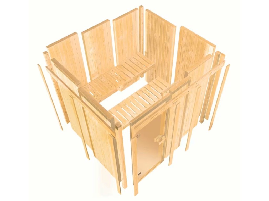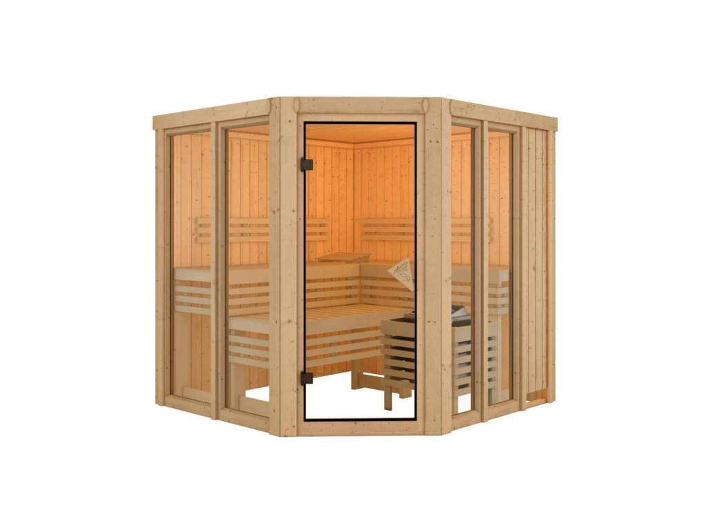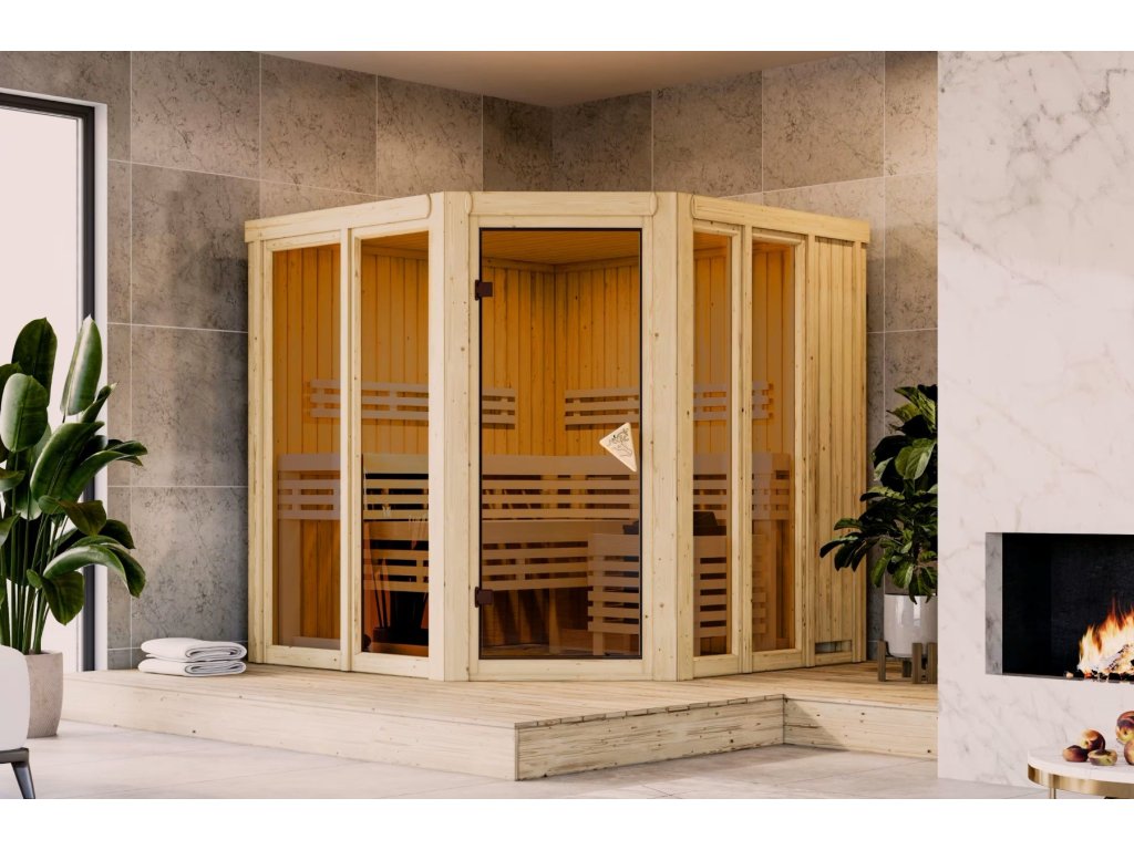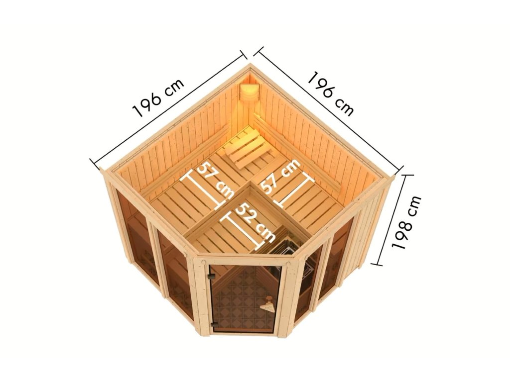 Finská sauna určená pro dvě ležící osoby. Má rozměr š 196 x h 196 x v 198 cm s rohovými dveřmi. Tento model finské sauny má 4x pevné okno. Sauna je určená do temperovaných interiérů domu nebo bytu. Její výrobce, firma KARIBU HOLZTECHNIK z německých Brém, dokázala svými výrobky úspěšně navázat na staletou tradici skandinávského saunování a současně do ní zapracovat dnešní moderní technologie.