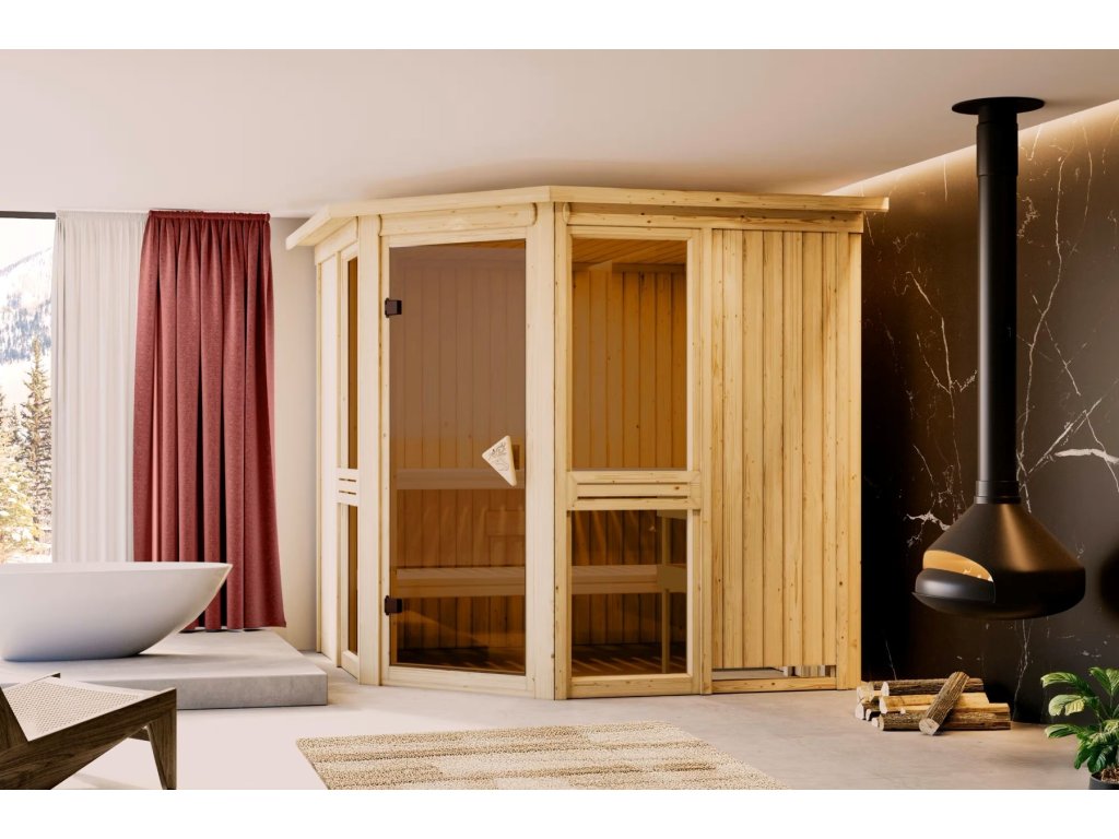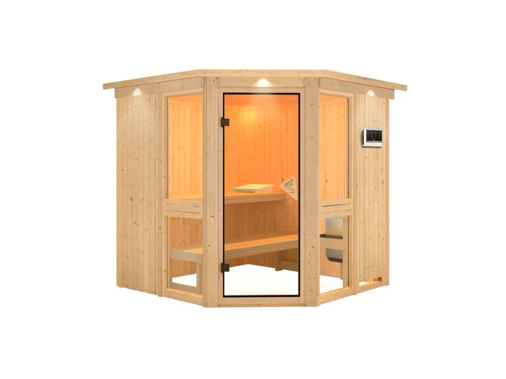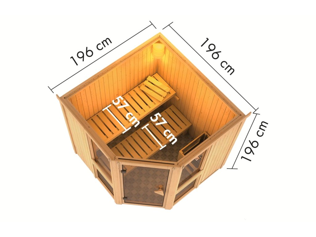 Finská sauna určená pro dvě ležící osoby. Má rozměr š 196 x h 196 x v 196 cm. Tento model finské sauny je určený do temperovaných interiérů domu nebo bytu. Stropní římsa včetně 3 LED světel šikovně dotváří atmosféru sauny. Její výrobce, firma KARIBU HOLZTECHNIK z německých Brém, dokázala svými výrobky úspěšně navázat na staletou tradici skandinávského saunování a současně do ní zapracovat dnešní moderní technologie. Sauna je celá vyrobena ze dřeva severského smrku v přírodním provedení. Dřevo pochází ze vzdáleného severu Evropy a je chemicky naprosto neošetřené (není ani namořeno ani nalakováno). V důsledku toho je prosté všech známých problematických látek, které by se v průběhu saunování mohly ze dřeva uvolňovat. Tato interiérová sauna vykazuje mimořádné tepelně-izolační vlastnosti. Stěny sauny jsou složeny z vnitřní a vnější vrstvy speciálně hlazených prken s perem a drážkou, mezi kterými je 42 mm silná tepelná izolace v podobě minerální vlny. Celková síla stěny je tak 68 mm. Zadní nebo boční nepohledové strany orientované ke stěně místnosti mají vnější stranu ze sololitu. Proto jsou při stejné tepelné izolaci o cca 10 mm tenčí než pohledové strany pokryté palubkami.