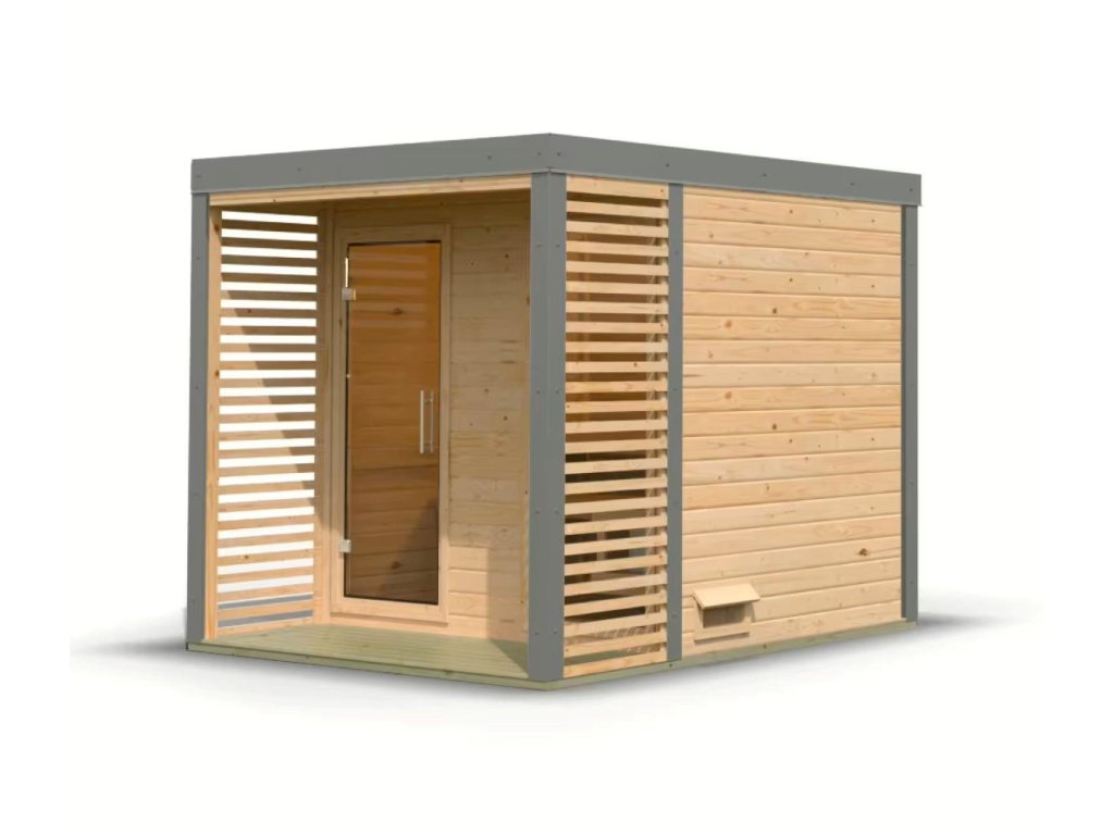 - barva: přírodní dřevo (sauna) + světle šedé oplechování