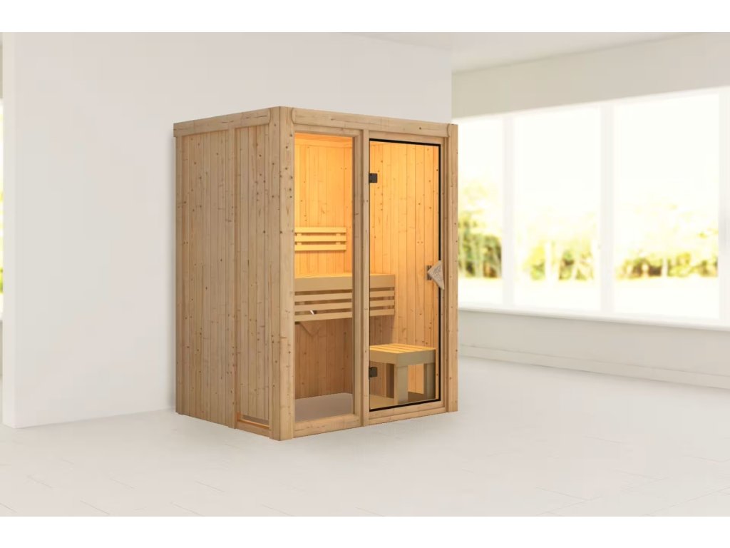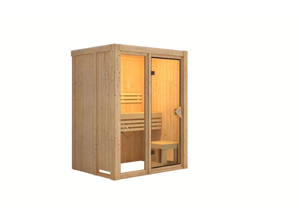Finská sauna určená pro dvě osoby v sedě. Má obdélníkový tvar o rozměrech š 155 x h 122 x v 198 cm. Tento model finské sauny je určený do temperovaných interiérů domu nebo bytu. Její výrobce, firma KARIBU HOLZTECHNIK z německých Brém, dokázala svými výrobky úspěšně navázat na staletou tradici skandinávského saunování a současně do ní zapracovat dnešní moderní technologie. Sauna je celá vyrobena ze dřeva severského smrku v přírodním provedení. Dřevo pochází ze vzdáleného severu Evropy a je chemicky naprosto neošetřené (není ani namořeno, ani nalakováno). V důsledku toho je prosté všech známých problematických látek, které by se v průběhu saunování mohly ze dřeva uvolňovat. Tato interiérová sauna vykazuje mimořádné tepelně-izolační vlastnosti. Stěny sauny jsou složeny z vnitřní a vnější vrstvy speciálně hlazených prken s perem a drážkou, mezi kterými je 42 mm silná tepelná izolace v podobě minerální vlny. Celková síla stěny je tak 68 mm. Zadní nebo boční nepohledové strany orientované ke stěně místnosti mají vnější stranu ze sololitu. Proto jsou při stejné tepelné izolaci o cca 10 mm tenčí než pohledové strany pokryté palubkami.