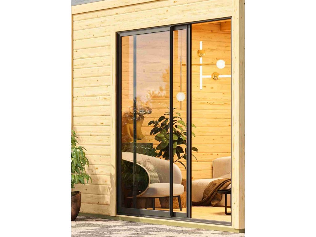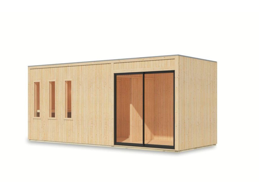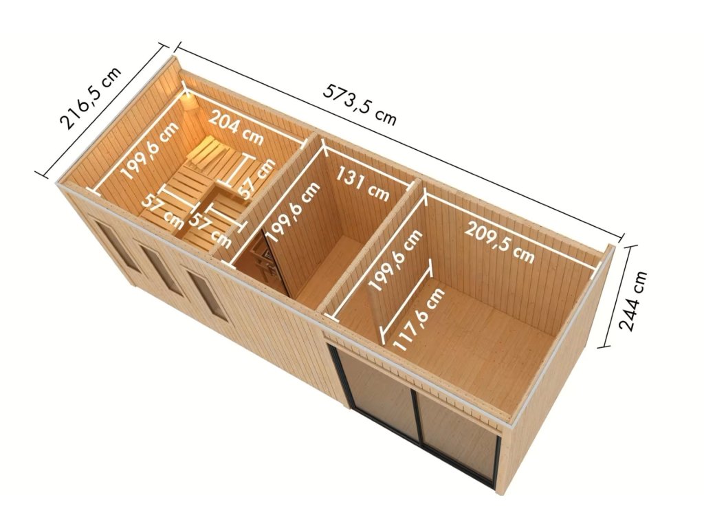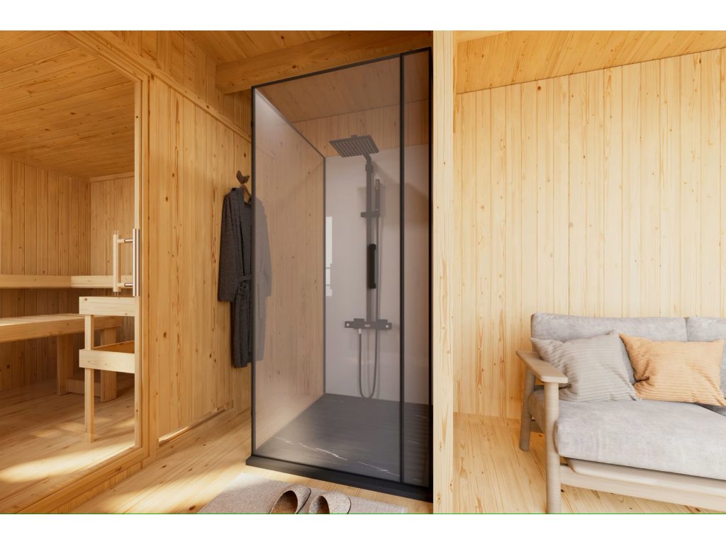 Tato luxusní venkovní sauna o rozměrech š 574 x h 217 cm přináší sofistikovaný wellness zážitek přímo do vaší zahrady. Díky 73 mm silným, minerální vlnou izolovaným stěnám, modernímu designu s plochou střechou a hliníkovými posuvnými dveřmi nabízí nejen výjimečné tepelně-izolační vlastnosti, ale i stylový vzhled. Interiér zahrnuje saunu s třemi pohodlnými lehátky z osiky, která pojme až 5 sedících osob, prostornou předsíň, kterou lze využít jako šatnu, relaxační zónu nebo úložný prostor, a dokonce i integrovanou místnost pro sprchu či toaletu. Velká okna z čirého skla zajišťují dostatek denního světla a propojení s přírodou, zatímco prosklené dveře mezi saunou a předsíní navozují vzdušnost a klid. Ideální pro každodenní relaxaci.