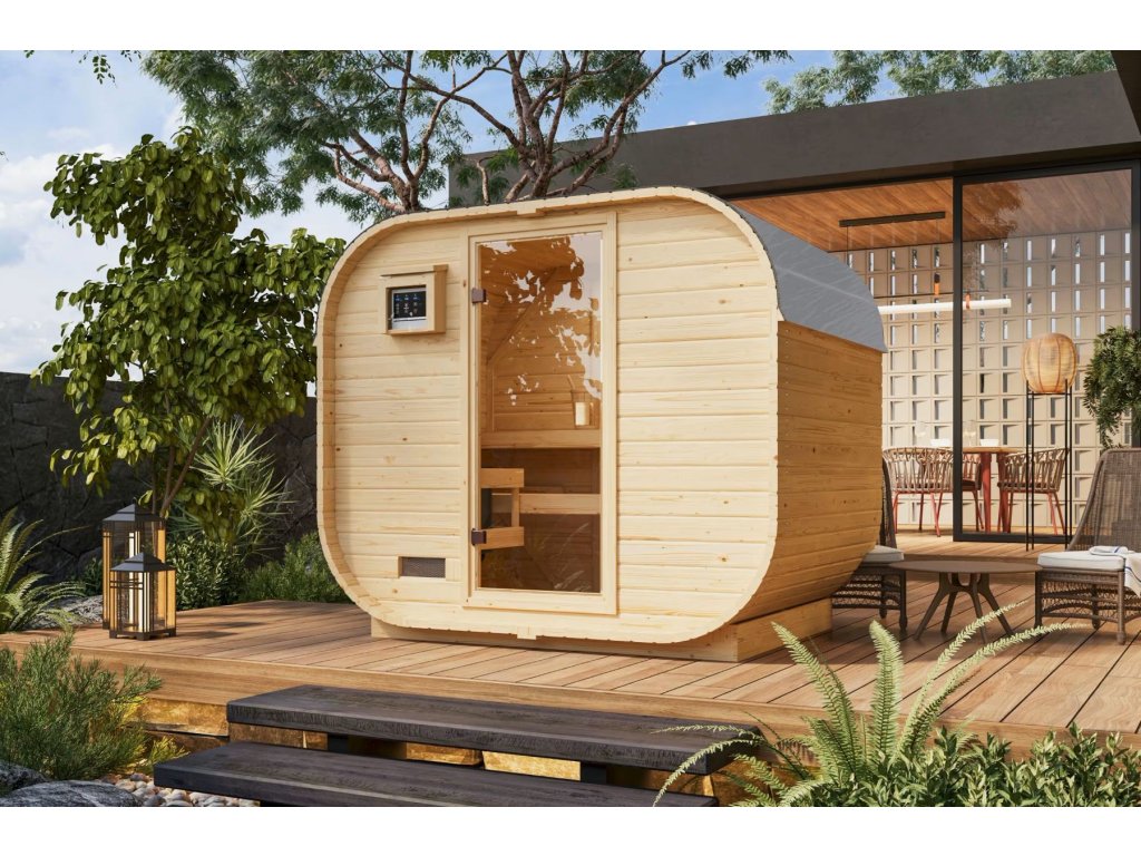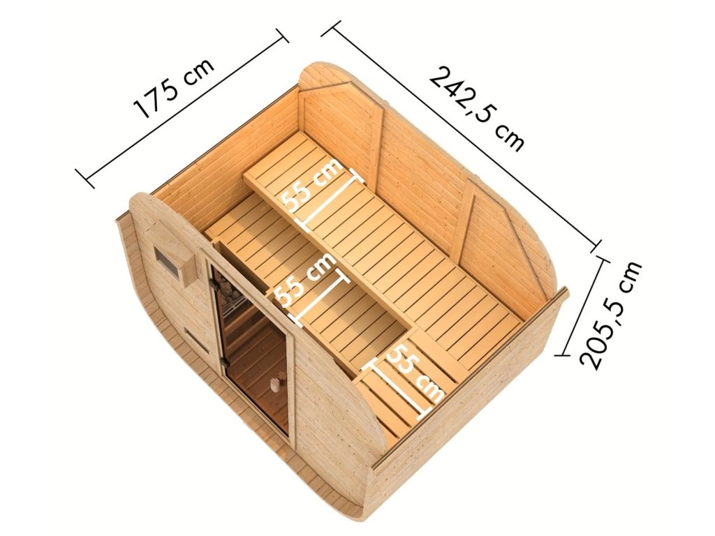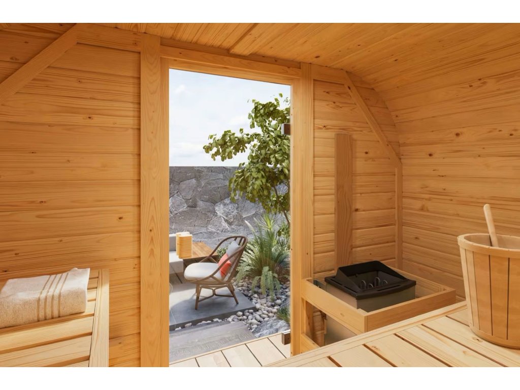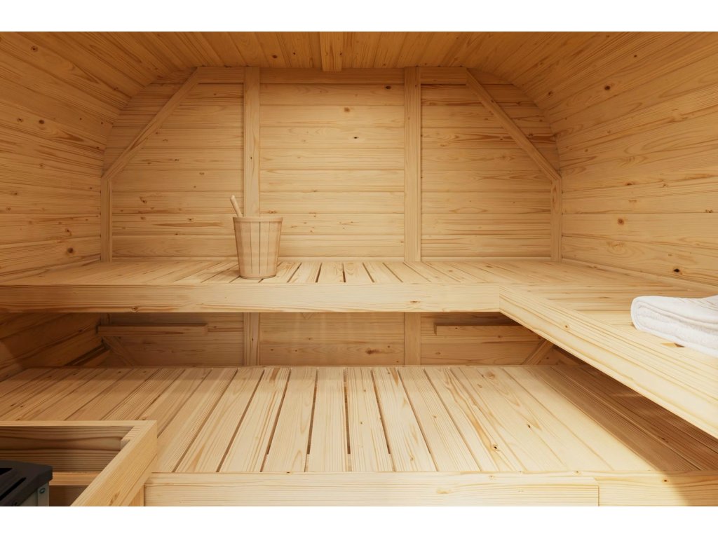 Kamna nejsou obsahem dodávky sauny. Jde o venkovní saunu, takže doporučujeme dokoupit výkonná 9 kW kamna. Vyžaduji však 400 V, jištění 16 A, kabel 5 x 2,5 mm a zapojení doporučujeme odborníkem. Velkou výhodou je rychlé vyhřátí sauny. Nevýhodou je však prvotní komplikovanější zapojení a o něco vyšší spotřeba proudu. Dodáváme s integrovaným ovladačem přímo na kamnech nebo s externím digitálním ovladačem (pro montáž zvenku sauny). Všechny modely kamen mají vnitřní části z koroze odolných materiálů a jsou dodávány včetně 18 kg saunových kamenů.