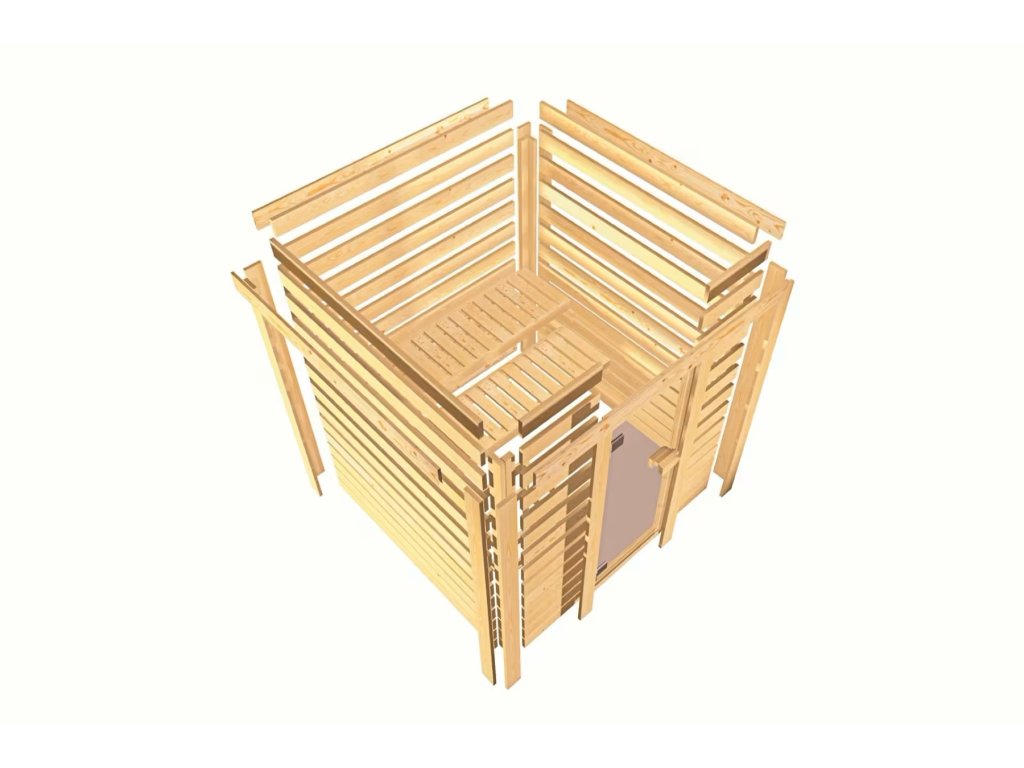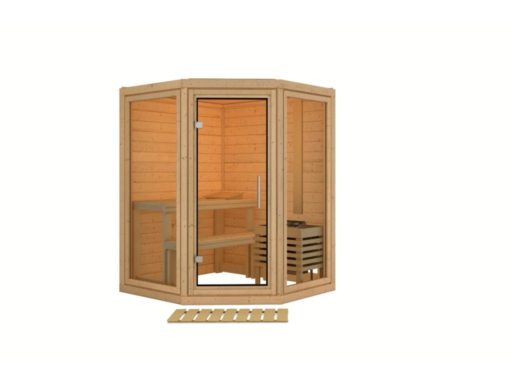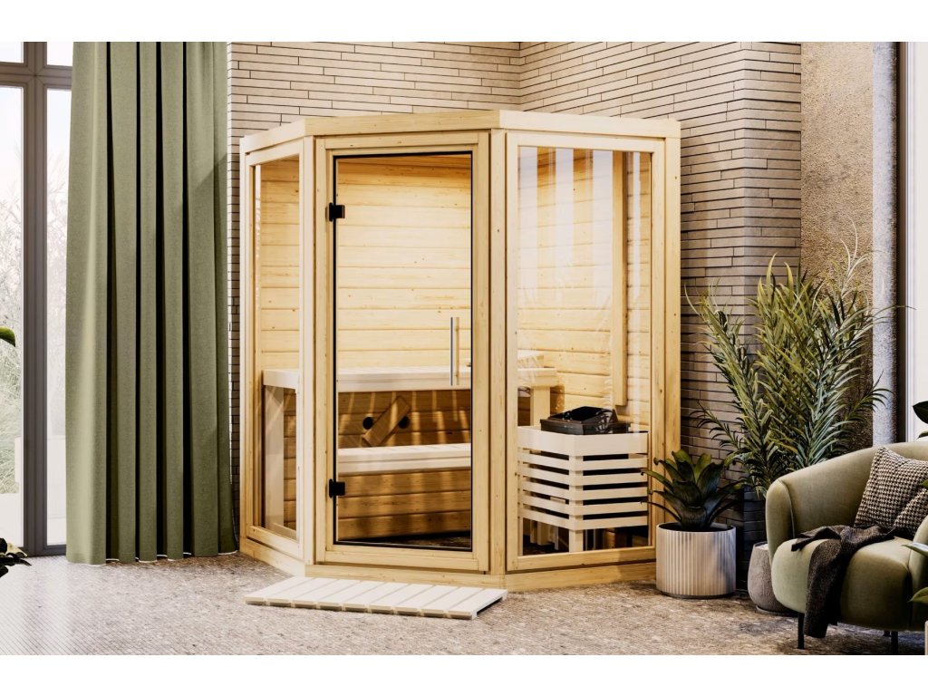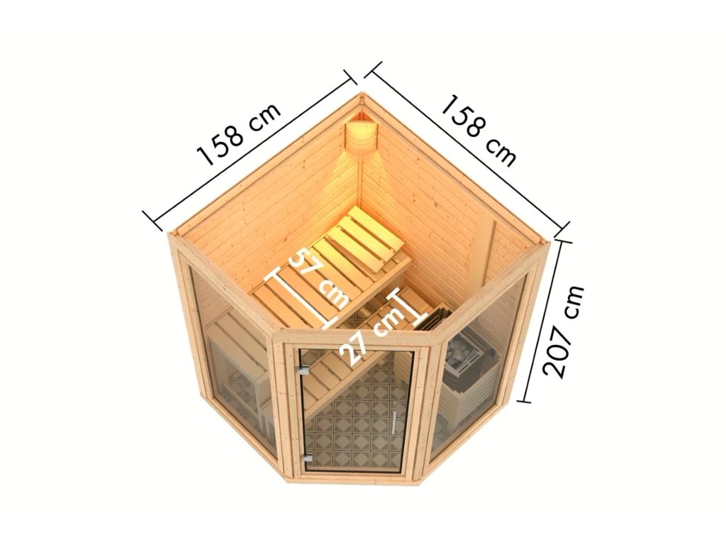 Finská sauna určená pro dvě sedící osoby. Má rozměr š 158 x h 158 x v 207 cm s rohovými dveřmi. Tento model finské sauny je určený do temperovaných interiérů domu nebo bytu. Její výrobce, firma KARIBU HOLZTECHNIK z německých Brém, dokázala svými výrobky úspěšně navázat na staletou tradici skandinávského saunování a současně do ní zapracovat dnešní moderní technologie. Sauna je celá vyrobena ze dřeva severského smrku v přírodním provedení. Dřevo pochází ze vzdáleného severu Evropy a je chemicky naprosto neošetřené (není ani namořeno ani nalakováno). V důsledku toho je prosté všech známých problematických látek, které by se v průběhu saunování mohly ze dřeva uvolňovat. Tato interiérová sauna je vyrobena z masivního dřeva síly 38 mm. Stěny sauny jsou složeny ze speciálně hlazených prken s dvojitým perem a drážkou, což garantuje neobyčejnou pevnost spoje.