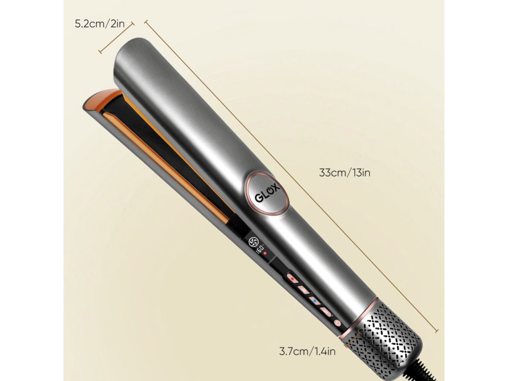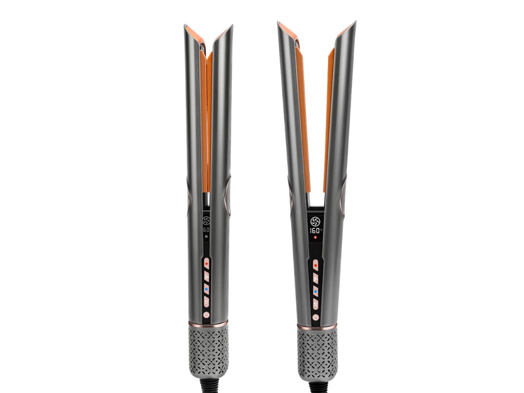 Žehlička využívá lineární, řízený proud vzduchu, který současně vyhlazuje a suší vaše vlasy. Díky tomu je styling snadnější a zajišťuje přirozeně lesklé a hladké vlasy při každém použití. Žehlička pracuje bez topných desek, bez poškození horkem. Inovativní technologie využívá přesně namířené a ohřáté proudy vzduchu pro efektivní vyhlazení vlasů. Vzduch je vyfukován dolů pod úhlem 45st k vytvoření potřebného napětí pro narovnání vlasů a hladkého zakončení účesu. Na rozdíl od běžných žehliček, které vlasy vysušují, naše žehlička zachovává přirozenou vlhkost vlasů, čímž snižuje lámání a udržuje vlhkost od kořínků po konečky. Funkce pro vlhké i suché vlasy Tato žehlička je navržena tak, aby efektivně fungovala na vlhké i suché vlasy. Nabízí čtyři stupně přednastavené teploty: 80 stC, 120 stC, 140 stC a 160 stC. Nastavit si můžete dvě rychlosti proudění vzduchu, což vám umožňuje přizpůsobit nastavení podle vašich potřeb a typu vlasů. Osvěžte své vlasy a dosáhněte rovného stylingu bez krepatění, ať už pracujete s vlhkými nebo suchými vlasy. Výběr teploty závisí na vašem konkrétním stylu a preferencích. Žehlička je vybavena vysokorychlostním bezkartáčovým motorem, který dosahuje 110 000 otáček za minutu a vytváří vysoký tlak pro snadné vyhlazení vlasů při sušení. Barevný LCD displej zobrazuje aktuální nastavení. Skleněné kuličkové termistory umístěné v ramenech přístroje regulují teplotu vzduchu až 30 krát za sekundu, aby zabránily přehřátí a poškození vašich vlasů. Přitisknutím horní a spodní desky k sobě aktivujete silný proud vzduchu a uvolněním automaticky snížíte sílu proudu vzduchu. Naše exkluzivní balení je ideální jako dárek pro vaše blízké.Obsah balení: