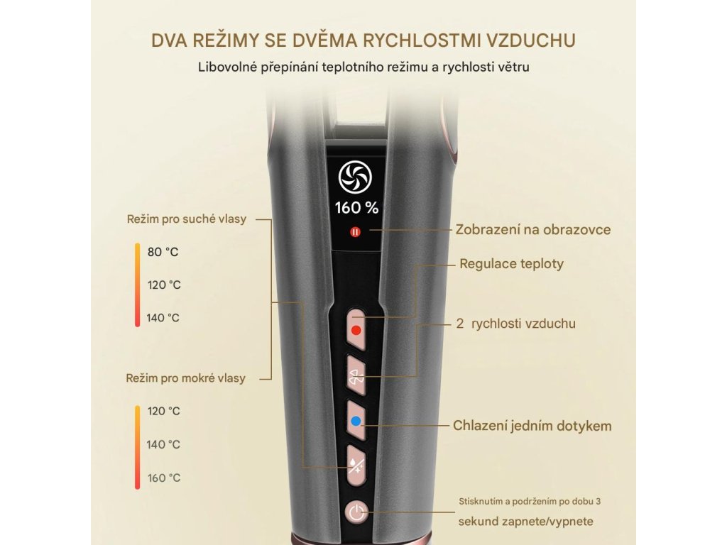 | Teplotní režim vlhé vlasy: | 120 stC, 140 stC, 160 stC |