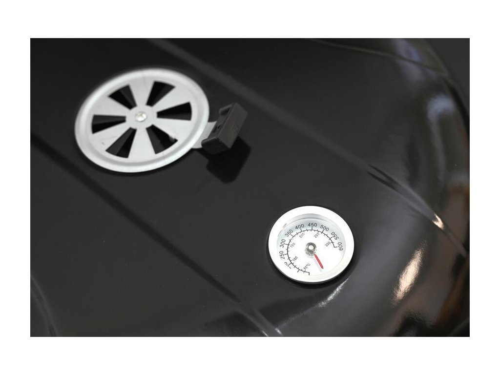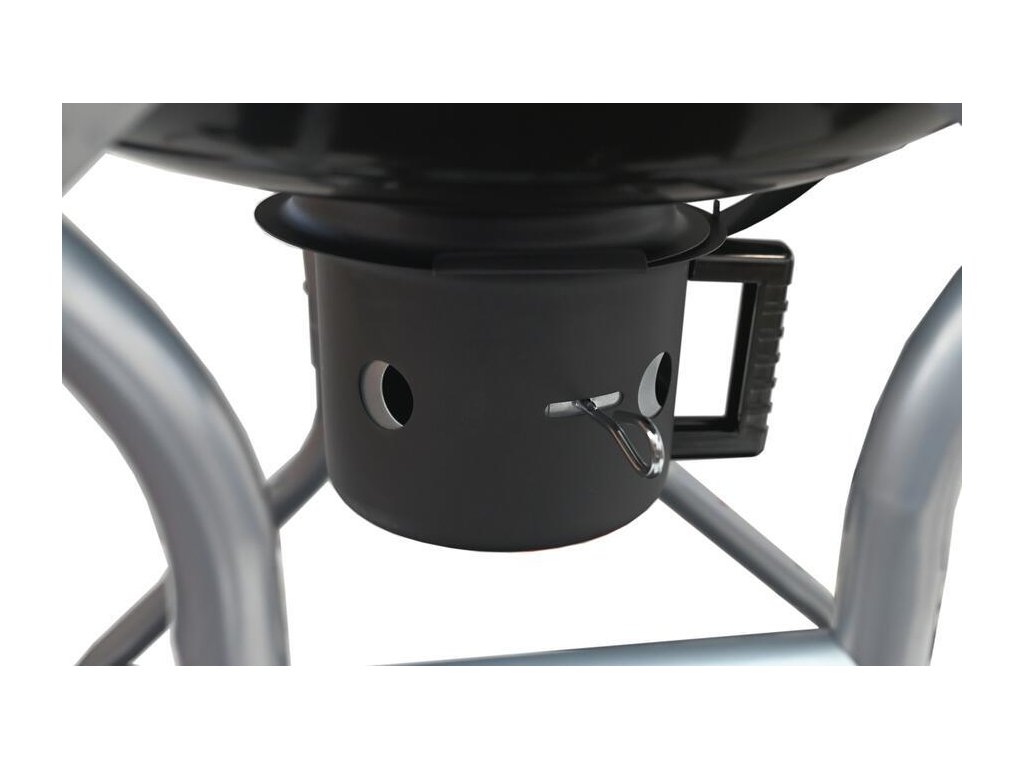 Gril je vybaven chromovaným roštem o průměru 54 cm umístěným ve výšce 81 cm a doplněným odkládací mřížkou pro udržení teploty hotových pokrmů. Vyklápěcí víko z nerezové oceli se smaltovaným povrchem obsahuje vestavěný teploměr a regulaci ventilace, díky čemuž máte přípravu pokrmů plně pod kontrolou. Ve spodní části grilovacího prostoru se nachází vysouvací popelník s nastavitelným prouděním vzduchu pro snadnou údržbu a efektivní hoření.