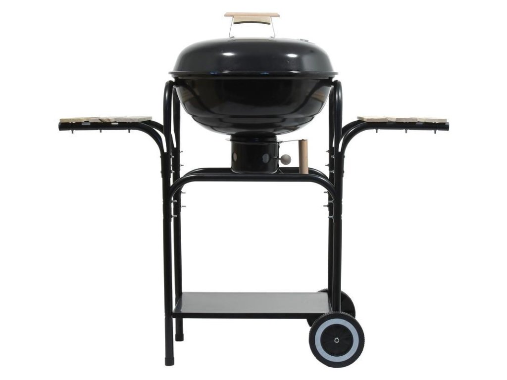 Konstrukce grilu je vyrobena z kvalitního ocelového plechu se smaltovanou povrchovou úpravou, která zajišťuje dlouhou životnost a snadnou údržbu. Chromovaný grilovací rošt poskytuje dostatek prostoru pro tepelnou přípravu masa, zeleniny i dalších pokrmů. Regulovatelná ventilace umožňuje přesnou kontrolu teploty během grilování a vysouvací popelník usnadňuje čištění. Odnímatelné víko je z vnitřní strany opatřeno hákem pro pohodlné zavěšení na bok grilu. Stabilitu zajišťují kovové nohy se zpevňujícím rámem a snadnou manipulaci umožňují plastová kolečka.