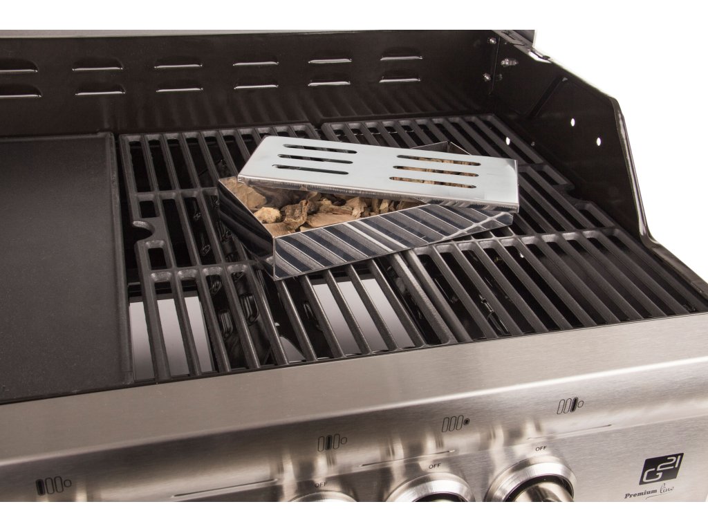 G21 box na uzení s víkem je pevný a stabilní i při vysoké teplotě uvnitř grilu. Vyrobili jsme jej z nerezu a opatřili otvory ve spodní stěně i ve víku. Díky těmto průduchům se kouř uvolňuje ven z boxu a plní vnitřní prostor grilu.