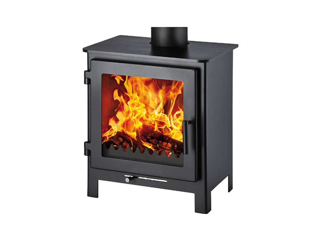 Malá praktická krbová kamna v černé barvě. Kovové dveřní kliky. Komínová klapka. Prostor pro uskladnění dřeva