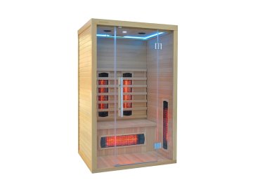 Infrasauna pro 2 osoby, 131×112×198 cm; 6× redlight zářič, dřevo - jedlovec (hemlock), regulace teploty a času, LED terapie, FM rádio, bluetooth, USB.