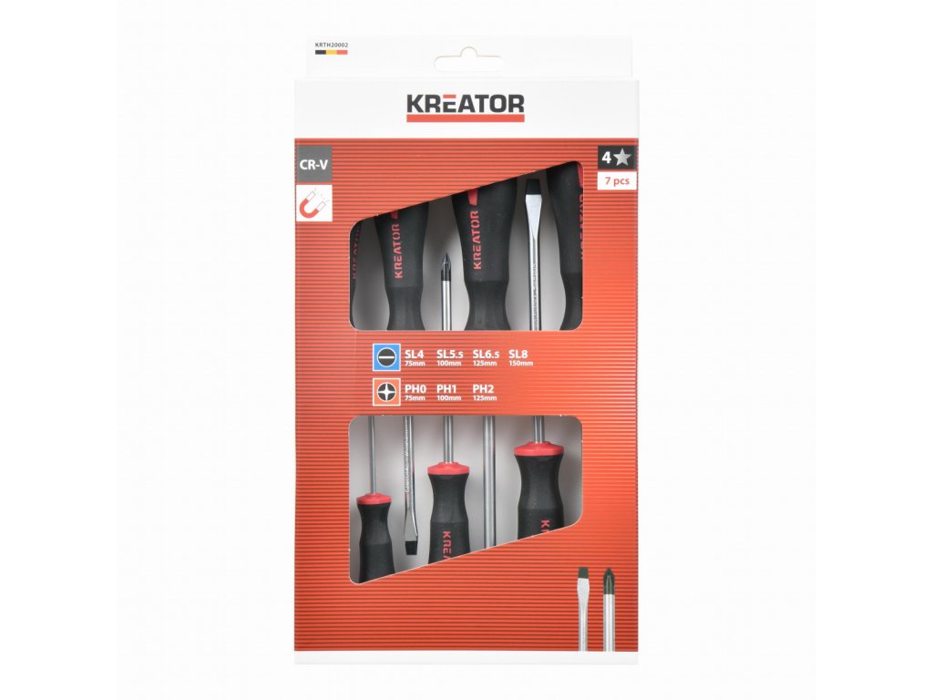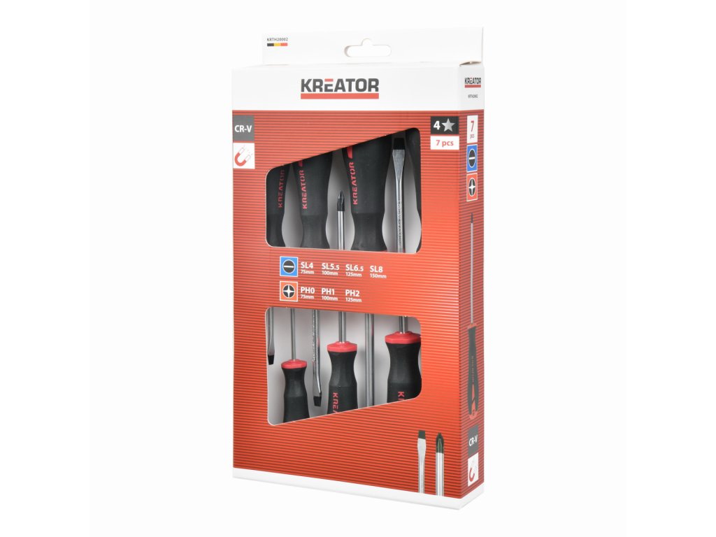 Tato sada se 7 šroubováky KRTH20002 z naší řady Kreator je vyrobena z chrom-vanadiové oceli a šroubováky mají magnetický hrot, takže můžete snadno upevnit každý šroub. Sada obsahuje ploché šroubováky a také šroubováky PH. Měkká ergonomicky tvarovaná protiskluzová rukojeť zajišťuje pevný úchop.Obsah balení: