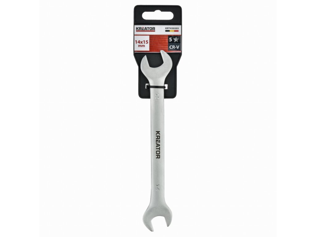 Tento dvojitý otvorený kľúč KRTH30205 od Kreator má dĺžku 175 mm a je vyrobený z vysoko kvalitného chróm-vanádiového zliatiny. Konce majú otvory rôznych veľkostí. Jeden je široký 14 mm a druhý 15 mm.Obsah balení: