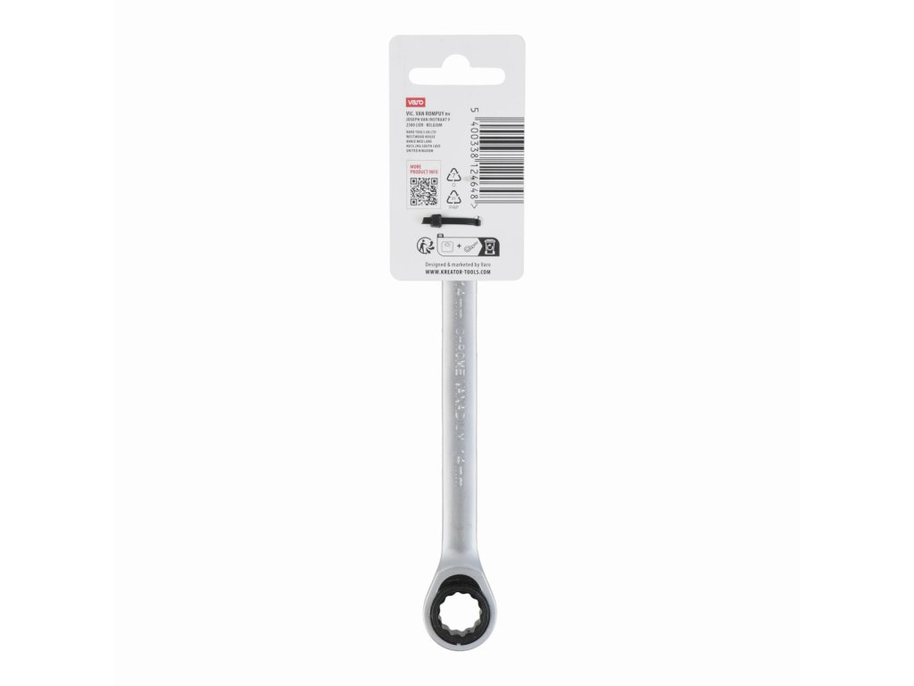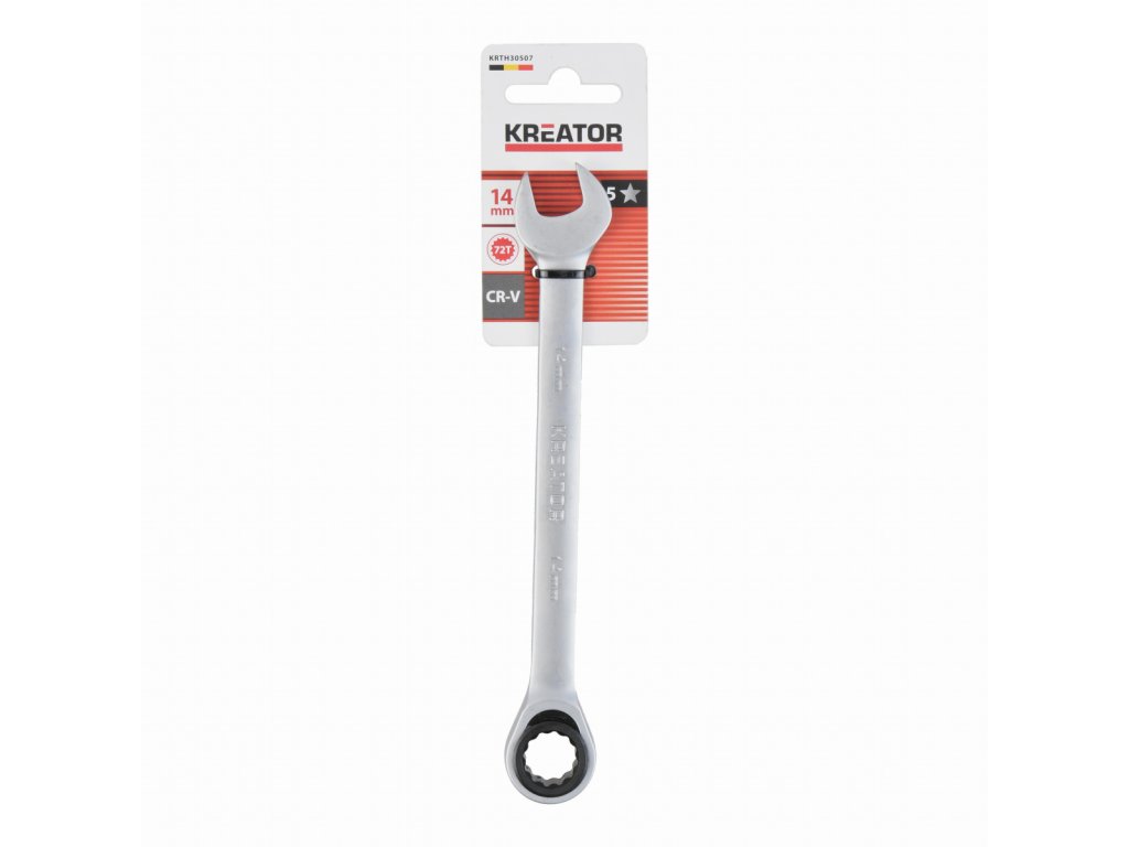 Tento kombinovaný očko ráčna / otevřený klíč KRTH30507 od Kreator je vyroben z vysoce kvalitní chrom-vanadiové slitiny. Délka klíče je 192 mm a má průměr 14 mm. Očko je opatřeno kvalitním strojkem, který má 72 zubů.Obsah balení: