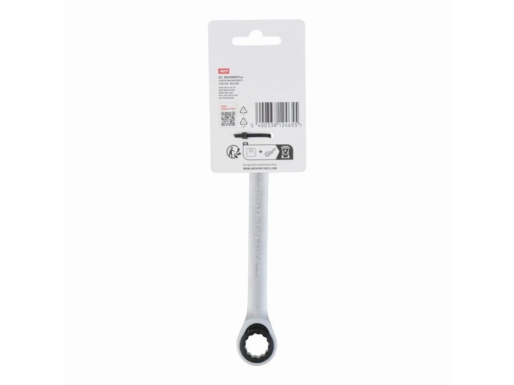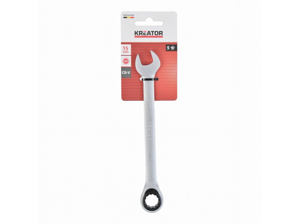 Tento kombinovaný očko ráčna / otevřený klíč KRTH30508 od Kreator je vyroben z vysoce kvalitní chrom-vanadiové slitiny. Délka klíče je 207 mm a má průměr 15 mm. Očko je opatřeno kvalitním strojkem, který má 72 zubů.Obsah balení: