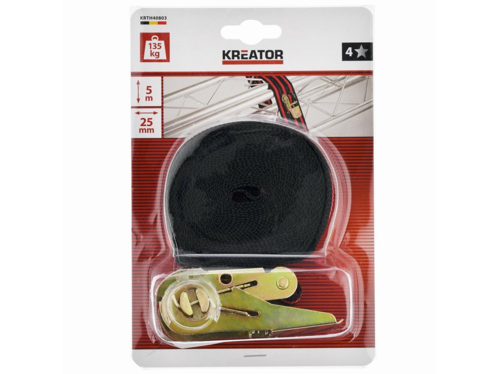 Upínací popruh s ráčnou ( kurtna ) KRTH40803 z naší řady Kreator slouží k rychlému, snadnému a pevnému zajištění nákladu při přepravě nebo skladování. Tento typ popruhů je ideální pro lehčí až středně těžké předměty. Pro upnutí nákladu slouží ráčna, díky které máte usnadněno jeho přitáhnutí. Tento upevňovací popruh zvládne hmotnost až 135 kg, je dlouhý 5 m a široký 25 mm.Obsah balení: