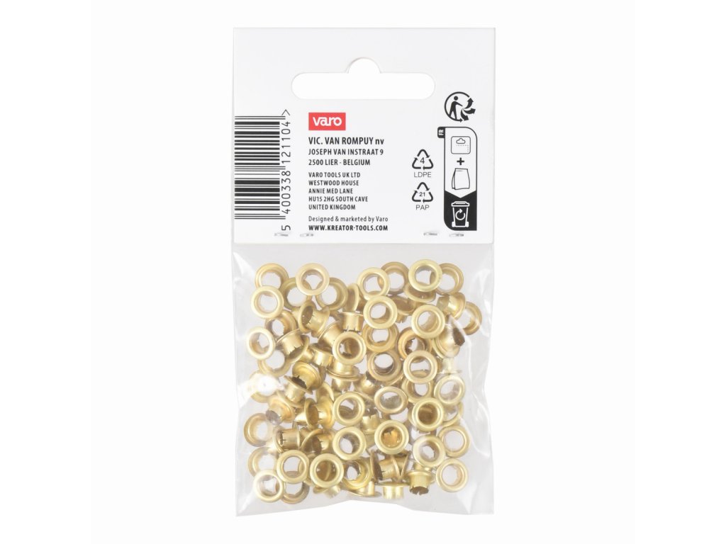 Tyto nýtovací očka KRTH62502 od Kreator mají vnitřní průměr 4,5 mm a lze je připevnit k textiliím a jiným tenkým materiálům pomocí kleští na nýtovací očka.Obsah balení: