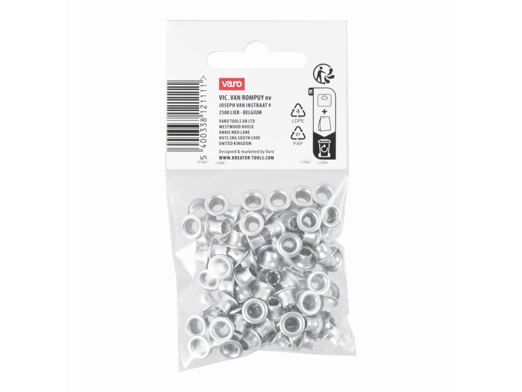 Tyto nýtovací očka KRTH62503 od Kreator mají vnitřní průměr 4,5 mm a lze je připevnit k textiliím a jiným tenkým materiálům pomocí kleští na nýtovací očka.Obsah balení: