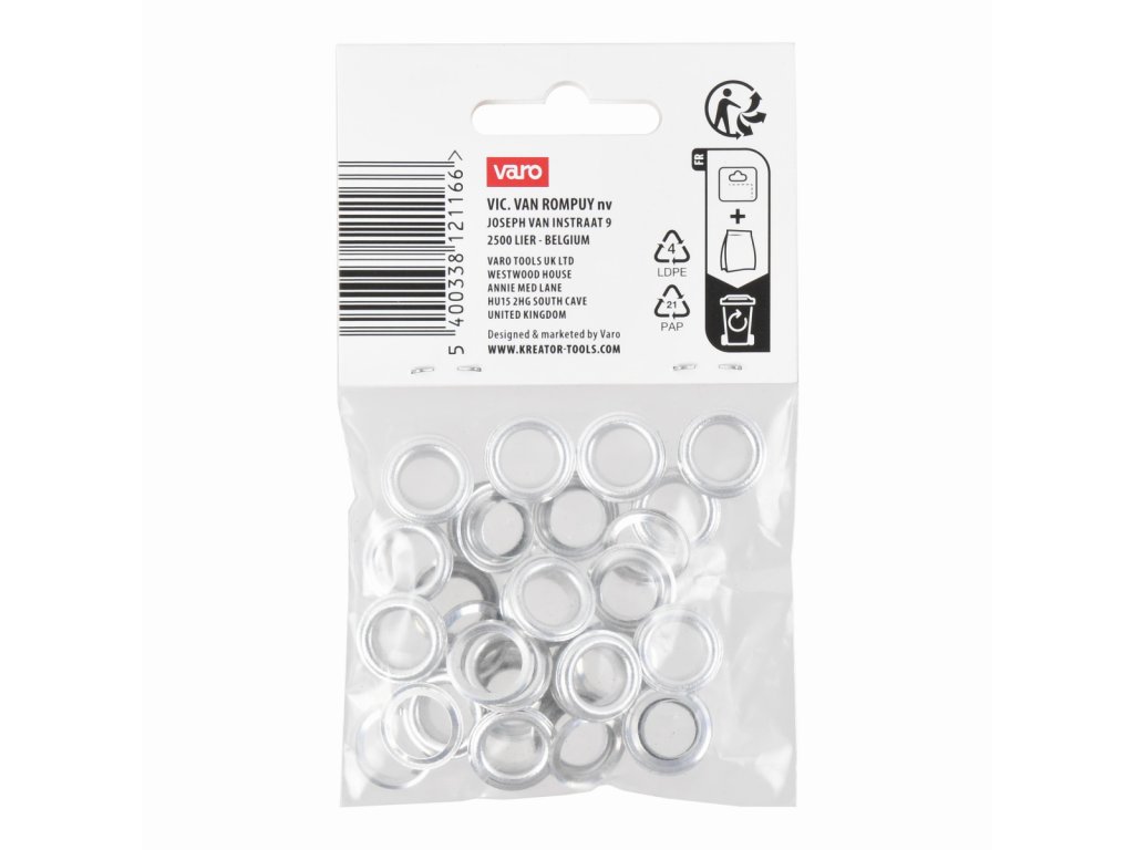 Tyto nýtovací očka KRTH62508 od Kreator mají vnitřní průměr 10 mm a lze je připevnit k textiliím a jiným tenkým materiálům pomocí kleští na nýtovací očka.Obsah balení: