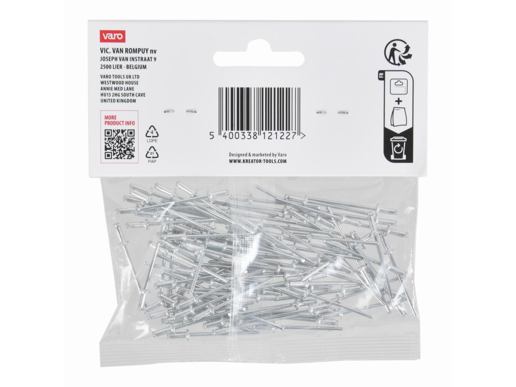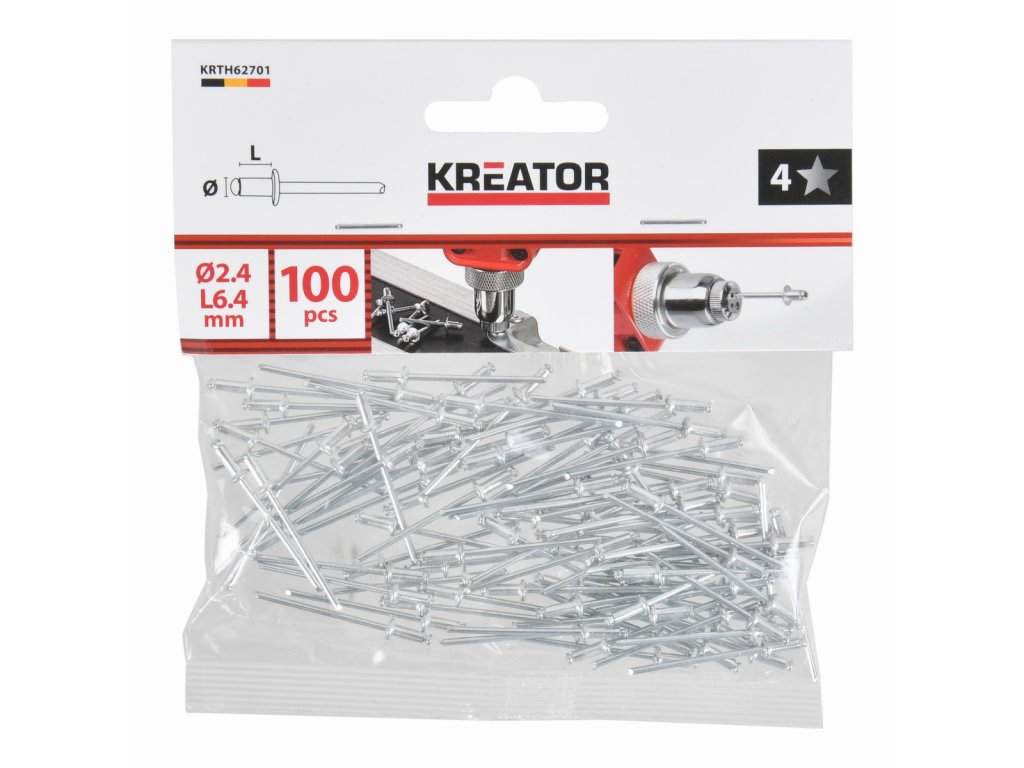 Tyto trhací nýty KRTH62701 z naší řady Kreator mají průměr 2,4 mm. Používejte je k rychlému a bezšroubovému spojení kovových, hliníkových nebo plastových předmětů o tloušťce až 3 mm. To se provádí pomocí nýtovacích kleští. Balení obsahuje 100ks.Obsah balení: