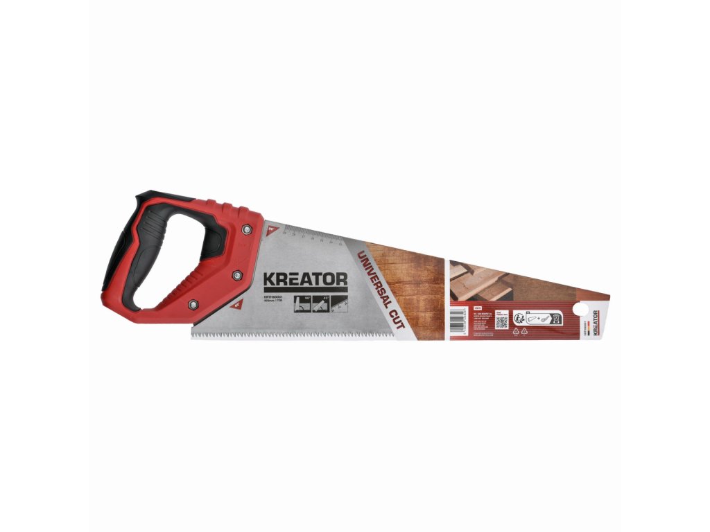 Tato ruční pila KRTH8001 od Kreator má 7 zubů na palec (TPI), což ji činí ideální pro přesné a detailní řezání. Flexibilní ocelová čepel dlouhá 400 mm je vybavena kalenými zuby broušenými ve třech různých úhlech, což zaručuje vždy ostré a čisté řezy. Pilka má navíc vodítka pro přesné řezy pod úhlem 45st a 90st a stupnici v milimetrech. Díky měkčené rukojeti je ruční pila velmi praktickým nástrojem pro každého řemeslníka.Obsah balení: