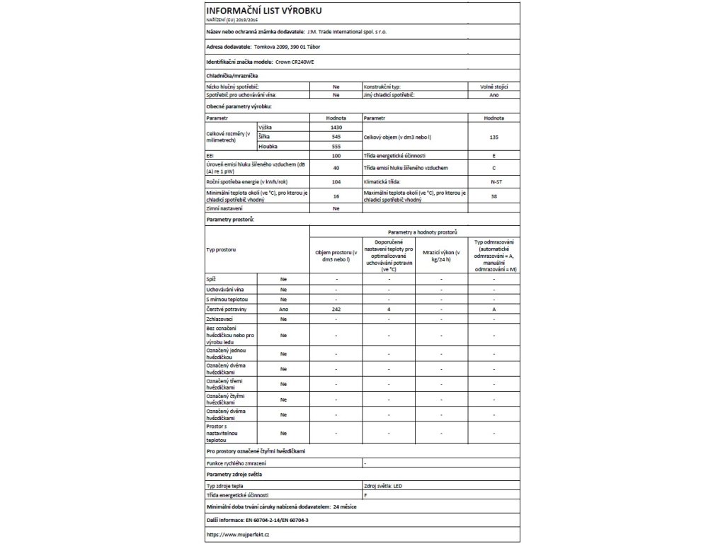 Lednice Crown nabídne velký objem 242 litrů pro vaše potraviny. Chladnička spadá do energetické třídy E. Vnitřní prostor lednice je přehledně uspořádán. Naleznete zde 4 nastavitelné police z tvrzeného skla a 4 úložné prostory ve dveřích. Chladničce nechybí ani zásuvka, která udrží ovoce i zeleninu déle čerstvé. Provoz chladničky vás rušit nebude, hlučnost dosahuje pouhých 40 dB. Lednice je vybavena funkcí automatického odmrazování.