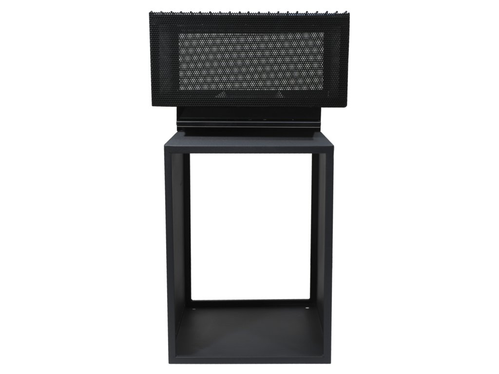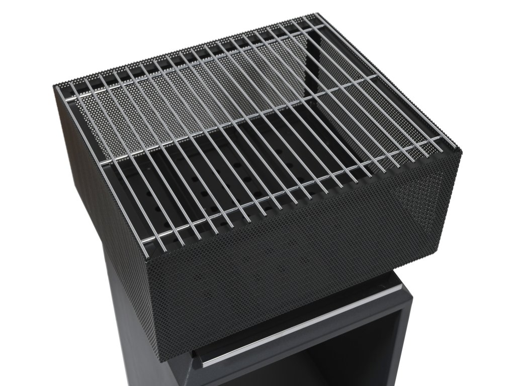 Čtvercová konstrukce ohniště se vyrábí z kvalitní oceli s vysokoteplotním černým nátěrem. Jeho strany jsou perforované a poskytnou vám unikátní pohled na hořící oheň. Dolní část využijete jako úložný prostor na dříví.