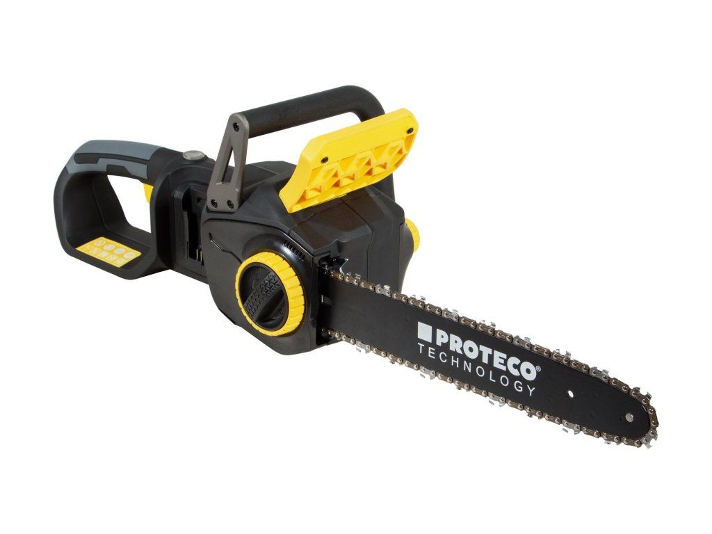 Akumulátorová řetězová pila PROTECO 40 V (2× 20 V) - Síla benzínu, komfort aku Potřebuješ prořezat zahradu, připravit dřevo na zimu nebo nařezat trámy v dílně – a nechceš tahat prodlužovačku ani řešit startování benzínového motoru? Tahle 40V řetězová pila PROTECO ti dá výkon decentní benzínové řetězovky, a přitom si zachová tichý a kultivovaný chod. Dva 20V akumulátory pohánějí moderní bezuhlíkový motor, který má vyšší účinnost, delší životnost a hlavně dostatek síly i pro silnější polena. Lišta o délce 36 cm (14”) ti dává jistotu i při práci s většími kusy dřeva. A díky rychlosti řetězu až 16 m/s řeže čistě, svižně a bez zbytečného trápení materiálu. Proč si ji oblíbíš? - Výkonný bezuhlíkový motor (1000 W) – vyšší účinnost, delší životnost a silný krouticí moment - Napájení 40 V (2× 20 V) – pro profesionální výkon - Rychlost řetězu až 16 m/s (2 rychlostní režim) – rychlé a čisté řezy - 36cm lišta (14”) – ideální poměr mezi obratností a výkonem - Automatické mazání řetězu – delší životnost a plynulý chod bez stálého přerušování práce - Napínání řetězu bez nářadí – rychlé dotažení přímo na krytu - Mechanická brzda řetězu – vyšší bezpečnost při práci - Ergonomická pogumovaná rukojeť – pevný úchop i při delší práci - Žádné zdržování. Žádné hledání klíčů. Jen vezmeš, nasadíš dvě baterie a řežeš. Pro koho je ideální? - Pro majitele domů a zahrad - Pro přípravu palivového dřeva - Pro řemeslníky, kteří chtějí mobilitu bez benzínu Technické parametry - Napětí: 40 V (2× 20 V) - Typ motoru: Bezuhlíkový - Výkon: 1000 W - Rychlost řetězu (1. rychlost/2. rychlost): 16 / 12 m za sekundu - Délka lišty: 36 cm (14”) - Rozteč řetězu 3/8” - Objem olejové nádržky: 80 ml - Brzda řetězu: mechanická - Hmotnost: cca 3,8 kg (bez akumulátorů) - Typ baterie: Aku program PROTECO 20 V Upozornění! - Pro plný výkon je nutné použít 2 akumulátory 20 V. - Oba rychlostní režimy jsou dostupné pouze při použití dvou 4 Ah baterií (nikoliv 2 Ah). - Akumulátory ani nabíječka nejsou součástí balení. - Chyba v návodu - reálná rozteč řetězu je 3/8”, nikoli 1/4”!!!Doplňkové parametry