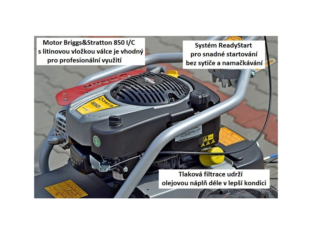 Motor Briggs&Stratton 850 Series má litinovou vložku válce, která zvyšuje jeho životnost na dvojnásobek a dále má olejový filtr a olejové čerpadlo, díky němuž jsou...
