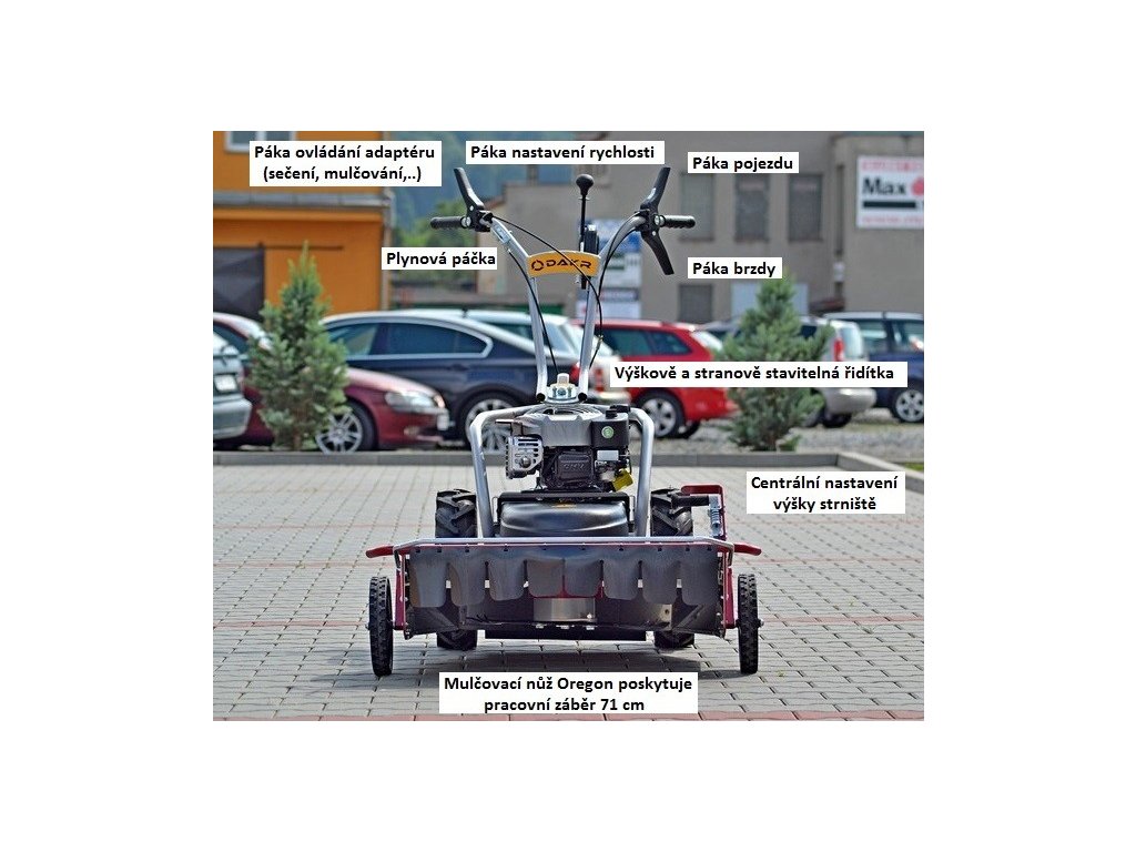 Novinka 2023 - stavebnicový mulčovač s pojezdem; záběr sečení 71 cm; max. výkon motoru Loncin 11 HP; hydrostatická převodovka a plynulá změna rychlosti vpřed i vzad