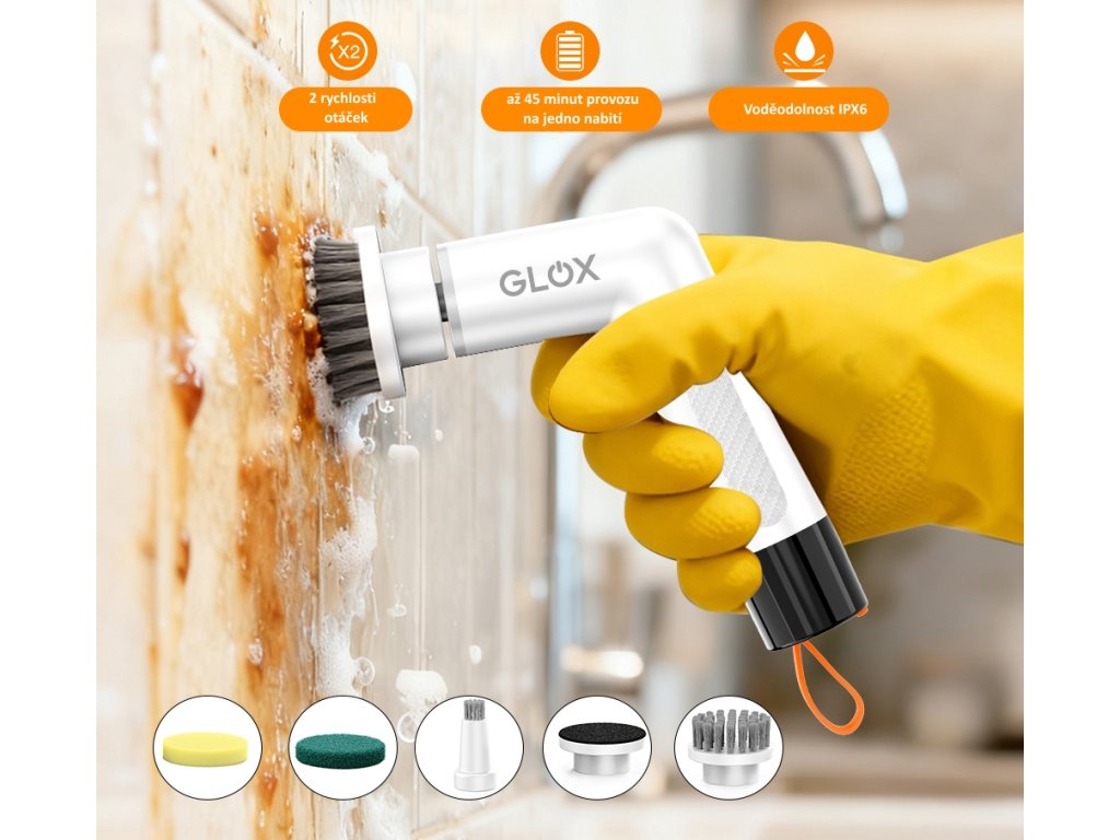 Elektrický čisticí mini kartáčAkumulátorový mini čisticí kartáč GLOX S3 vám umožní zvládnout úklid rychleji a s menší námahou. Tento elektrický pomocník je ideální pro každodenní údržbu i důkladnější drhnutí odolných nečistot.Díky výkonnému motoru, dvěma rychlostem otáčení a sada výměnných nástavců se snadno přizpůsobí různým povrchům a typům nečistot. Využijete jej v koupelně, kuchyni i při úklidu venku. Voděodolnost IPX6 zajišťuje ochranu proti stříkající vodě.Kartáčem pohodlně vyčistíte obklady a spáry, místa kolem baterií a sprchy, skleněné sprchové zástěny i další plochy, kde je potřeba dostat se do rohů a úzkých prostor.Klíčové vlastnostiVoděodolnost IPX6Vhodný do vlhkého prostředí, odolá stříkající vodě2 rychlosti otáčení230 ot./min pro běžné čištění320 ot./min pro odolnější nečistotyLi-ion baterie 1200 mAhAž 45 minut provozu na jedno nabitíNabíjení DC 5 VPraktické dobíjení, doba nabíjení cca 150 minutRychlá výměna příslušenstvíSnadné přepínání mezi nástavci podle aktuální potřebyVíce nástavců v baleníPro různé povrchy a typy čištěníEfektivní úklid bez námahyStabilní výkon kartáče je navržen tak, aby čistil svižně a bez zbytečného drhnutí rukou. Při vyšší rychlosti dosahuje až 320 ot./min, což usnadňuje odstranění i odolnějších usazenin.Stříkající voda? Žádný problémDíky krytí IPX6 můžete kartáč bez obav používat v koupelně nebo kuchyni, kde je vlhko a voda je běžnou součástí úklidu.Výměna příslušenství je rychlá a intuitivní – stačí nástavec vyměnit podle typu práce. Houbičku snadno upevníte pomocí suchého zipu, takže ji lze rychle sundat a vyměnit.Příslušenství v baleníMalý plochý kartáčKartáč s ostrou špičkou (na spáry a rohy)DrátěnkaHoubičkaSuchý zipObsah balení: