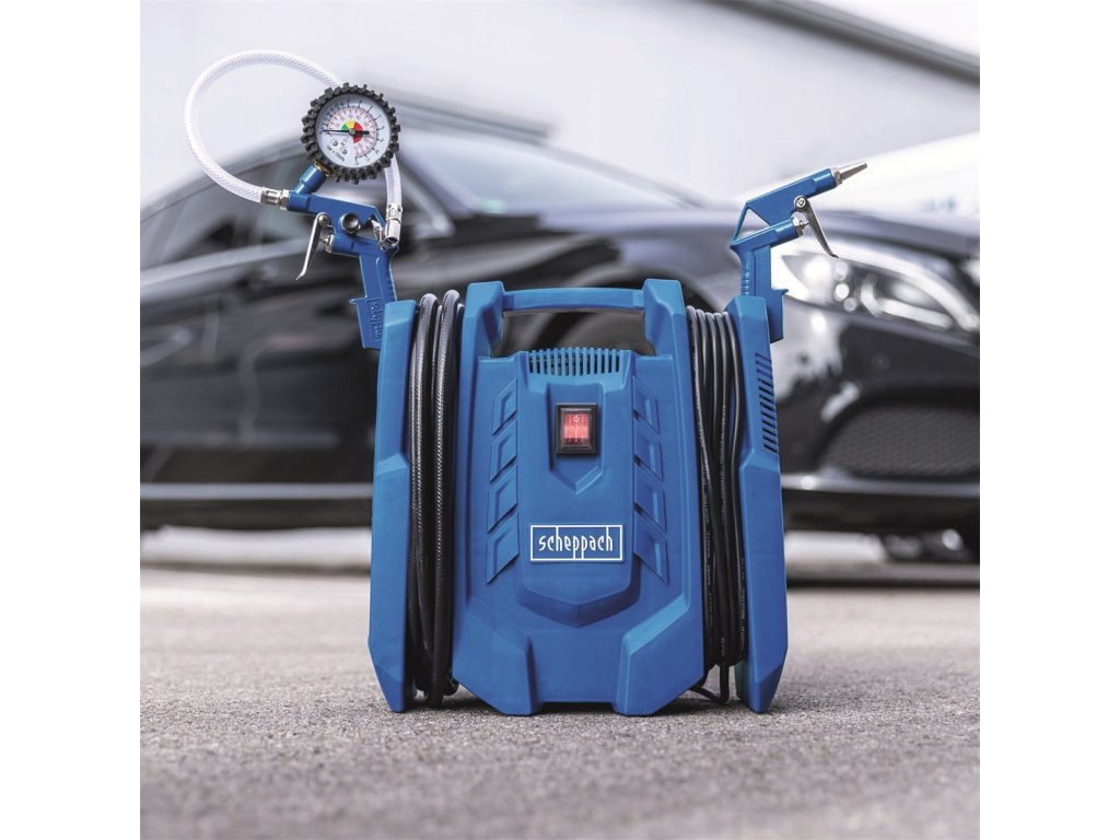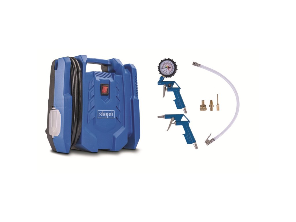 Kompresor Scheppach AIR FORCE 7 je praktický, skladný, lehký, výkonný a bohatě vybavený pomocník vhodný do každé domácnosti, chaty, karavanu nebo lodě. Díky třem různým koncovkám, silnému motoru 1100 W a vysokému pracovnímu tlaku 8 barů si hravě poradí s foukáním pneumatik motocyklů, kol, aut, terénních čtyřkolek, míčů, matrací, nafukovacích člunů, raftů apod.