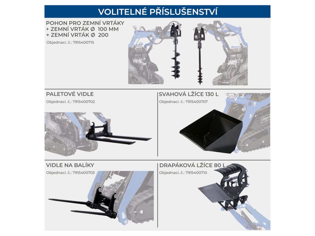 MKL 730 - pásový smykový nakladač Scheppach MKL 730 je kompaktní pásový nakladač, který bude zajisté neocenitelným pomocníkem na zahradě i stavbě. Díky své univerzálnosti a nosnosti až 200 kg se výborně hodí na různé stavební a manipulační práce, nakládání a přemisťování materiálu nebo úpravu terénu. S šířkou pouhých 740 mm se snadno dostane i do úzkých průchodů a hůře přístupných míst, kde by jiné stroje selhaly. Díky výkonnému čtyřtaktnímu benzínovému motoru o výkonu 8,5 HP (306 cm3) zvládá i náročnější práci s lehkostí a spolehlivostí. Pásový podvozek s možností samostatného ovládání každého pásu a šířkou 180 mm zajišťuje maximální stabilitu i v nerovném terénu. Nakladač si poradí se stoupáním až 25° a díky nízkému tlaku na podklad (32 kPa) se pohybuje šetrně i po měkkém povrchu. Obsluha je jednoduchá a bezpečná – ergonomická plošina s bezpečnostním spínačem a boční zábranou poskytuje komfort i ochranu při práci. Nakladač je vybaven hydraulickým rychloupínáním, takže výměna nástavců je otázkou okamžiku. V základní výbavě najdete lžíci o objemu 80 litrů, která je ideální pro každodenní použití. O dobrou viditelnost ve zhoršených světelných podmínkách se stará výkonné LED osvětlení. Kombinace maximální výšky zdvihu 2 500 mm a pojezdové rychlosti až 2,3 km/h vpřed i vzad zaručuje efektivní přemisťování materiálu. Navíc je k dispozici široká nabídka příslušenství, která rozšiřuje možnosti využití stroje a dělá z něj univerzálního partnera pro každodenní práci. Seznam dokoupitelného příslušenství SET pohonu pro zemní vrtáky + zemní vrtáky O 100 a O 200 mm Pohon pro zemní vrtáky Zemní vrták O 100 mm Zemní vrták O 200 mm Svahová lžíce 130 l Paletové vidle Drapáková lžíce 80 l Vidle na balíky Servisní zázemí Scheppach svým zákazníkům zároveň poskytuje širokou servisní síť, jejíž nedílnou součástí je i naše společnost. Využijte prodloužené záruky Bližší informace o záručních podmínkách naleznete zde. Případné bezpečnostní pokyny, výstrahy a upozornění jsou součástí návodu k obsluze, který je k dispozici v sekci KE STAŽENÍ. Kontaktní údaje výrobce / dovozce / zplnomocněného zástupce výrobce v EU: Scheppach GmbH Günzburger Str. 69, 89335 Ichenhausen, Germany email: service@scheppach.comNávod: http://data.garland.cz/attach/navody/scheppach/prepravniky/5915401903_MKL 730.pdf