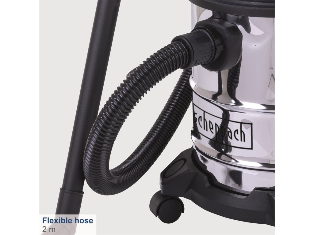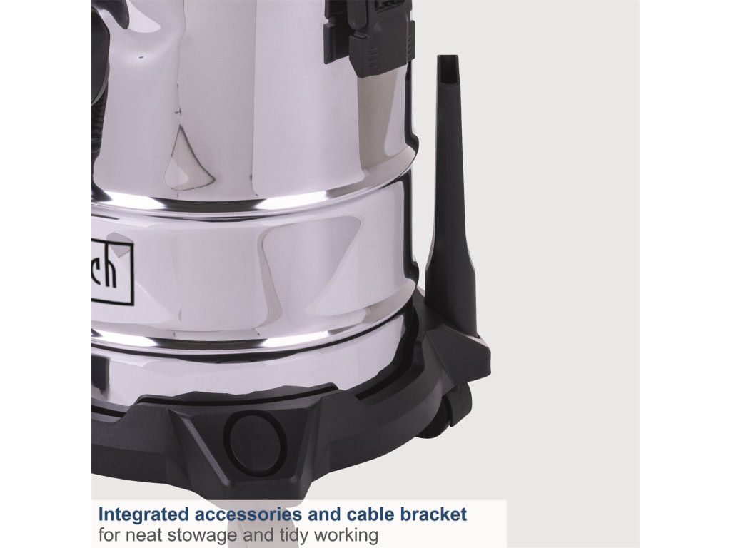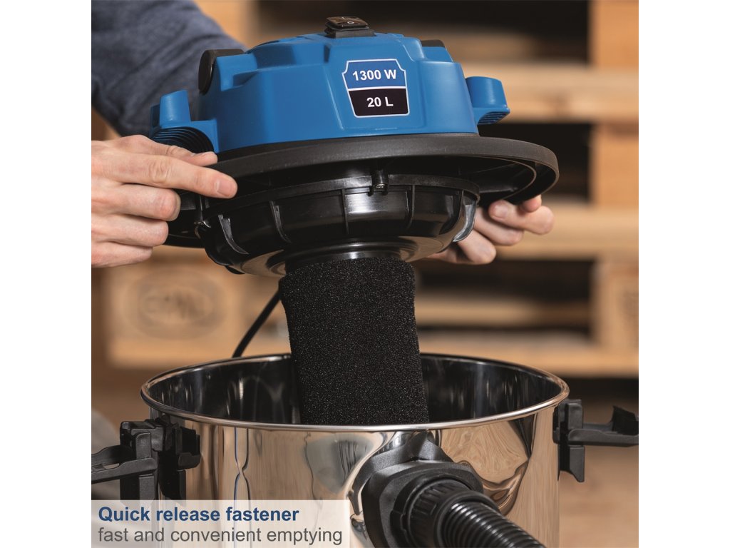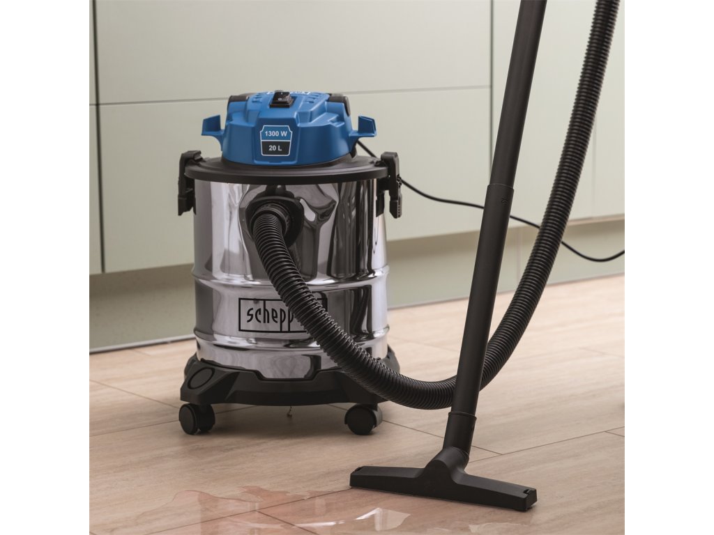 Srdcem přístroje je výkonný 1300 W elektromotor, jenž zajišťuje dlouhou životnost a spolehlivý chod. Velký pracovní dosah zajišťuje 4 m přívodní kabel, 2 m hadice a trojice prodlužovacích plastových trubic o délce 330 mm. Odolná nádoba z nerezové oceli s objemem 20 litrů je vybavena rychloupínacím uzávěrem, který umožňuje snadnou výměnu sáčku.Díky praktické držákové sadě je možné příslušenství uložit přímo na vysavač, takže máte vše vždy po ruce. Pro pohodlnou manipulaci je přístroj vybaven ergonomickým madlem a čtyřmi otočnými kolečky, která umožňují hladký pohyb do všech směrů.