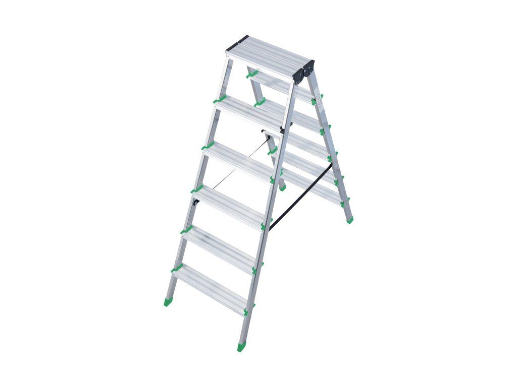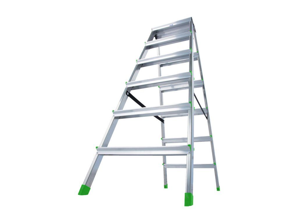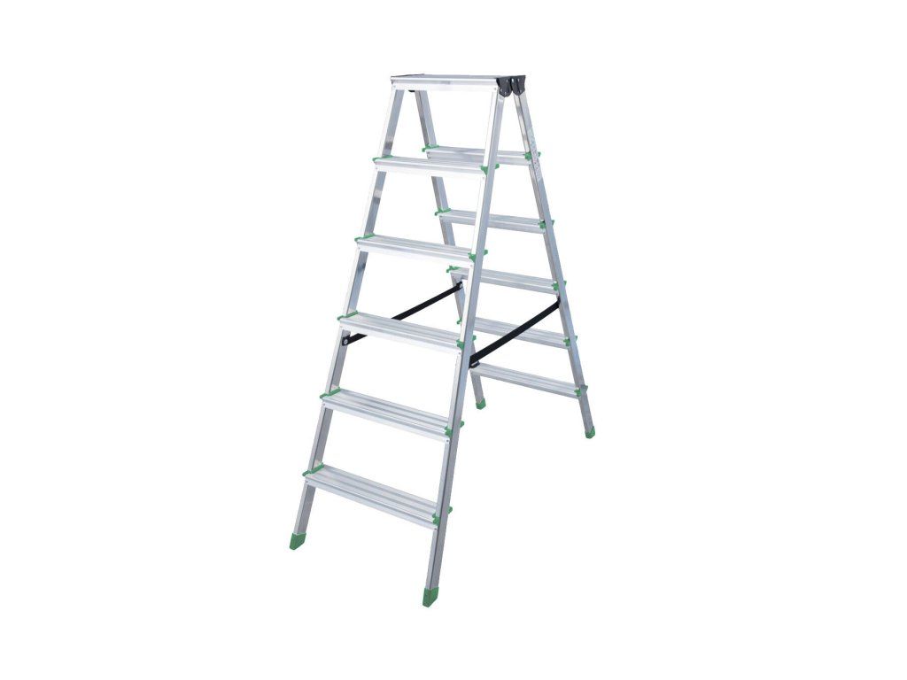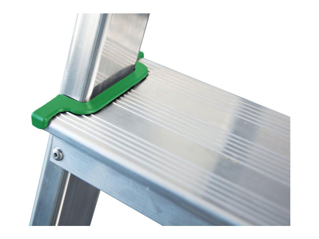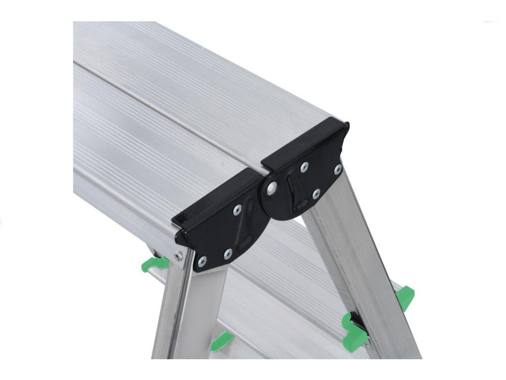 Lehké oboustranné hliníkové schůdky pro nejrůznější činnosti. Výhody a charakteristické znaky - Robustní nárazuvzdorný kovový kloub - 6 bodový nýtový spoj mezi stojkou a stupněm zajišťuje vysokou stabilitu - Protiskluzové, profilované patky šetrné k podlaze - Popruhy jako pojistka proti rozevření s vysokou pevností v tahu RozměryDoplňkové parametry