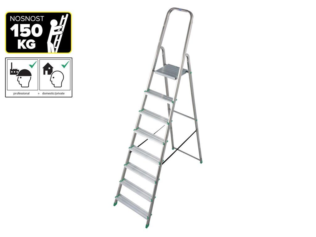 Kompaktní jednostranné hliníkové schůdky pro nejrůznější činnosti v interiéru. Výhody a charakteristické znaky - Vysoký bezpečnostní třmen - Nýtované kloubové spoje - Ocelová plošina s protiskluzovým provedením - Pevný nýtovaný spoj mezi stojkou a stupni - Protiskluzové patky zajišťují bezpečné stání - Stabilní stojky i opěry z hliníkových profilů obdelníkového průřezu - Maximální zatížení 150 kg RozměryDoplňkové parametry