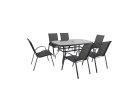 Stolová sestava se skládá z 6-ti pohodlných masivně vyztužených křesel v imitaci umělého ratanu s UV filtrem. Zobrazení 360° fotografie produktu >