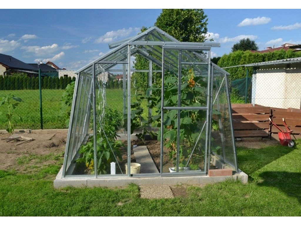 Skleník Lanitplast Limes VIVA V7 je masivní klasický skleník sedlového tvaru vyrobený z vysoce kvalitního žárově zinkovaného plechu tloušťky 1–2 mm. Jednotlivé profily jsou žárově pozinkované = ocel se po příslušné předběžné úpravě ponoří do zinkové lázně o teplotě cca 450°C, zinek a ocel přitom spolu reagují a na povrchu oceli se vytvoří slitina železa a zinku. Toto nezničitelné spojení zinku a oceli vytvoří extrémně silnou odolnost vůči korozi. Velkou výhodou tohoto modelu skleníku je to, že ho dodáváme jako jednoduchou stavebnici. Každý si může bez problémů postavit skleník na zahradě sám, kde chce a kdy chce. Nejste tak v dnešní složité době závislí na shánění drahé specializované firmy nebo řemeslníka, který by skleník na zahradě postavil. Jeho stavba je pro českého kutila relativně snadná a zvládnou ji dvě osoby. Díky stavbě svépomocí tak máte jistotu, že na jaře nepromeškáte žádné pěstitelské termíny jen proto, že drahá odborná montážní firma nestihla slíbený termín montáže.