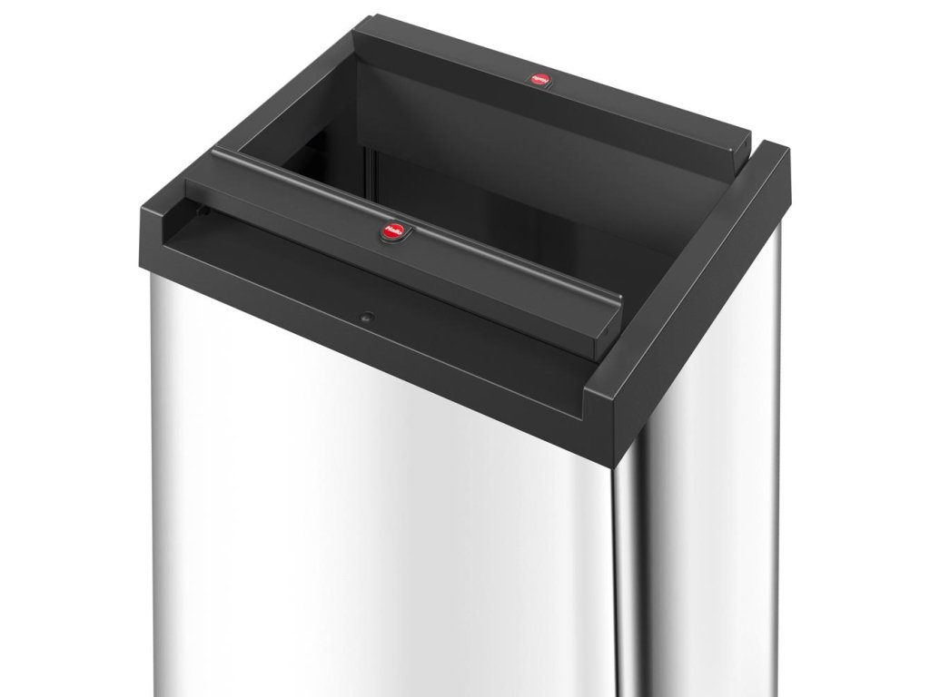 Velkoobjemový odpadkový koš Hailo Big-Box Swing má výkyvné dvoukřídlé víko s možností aretace. Optimalizovaný tvar víka s pojistkou pro otevření umožní snadné naplnění koše, poté se víko samo uzavírá. Vnitřní pytle na odpad se uchytí za červený plastový rám a nebudou už nikdy kazit čistý upravený dojem. Koše se dodávají v rozloženém stavu, jejich montáž je velmi snadná. Hranatý tvar vyzívá ke sloučení více boxů v jeden celek, třeba pro třídění odpadu.
