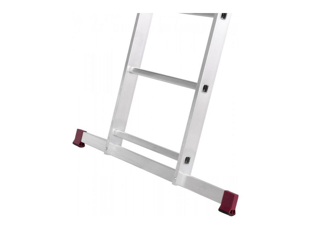 Trojdílný mnohoúčelový hliníkový žebřík je možné použití jako opěrný žebřík, štafle nebo výsuvný žebřík. Výhody a charakteristické znaky - Příčle s profilováním po obvodu - Ocelové vodící profily umožňují snadné vysouvání jednotlivých částí žebříku - Široká stabilizační traverza zajišťuje bezpečné stání - Protiskluzové patky - Bezpečnostní hákové pojistky proti samovolnému vysunutí částí žebříku při transportu a používání - Možnost odejmutí třetího dílu - Maximální pracovní výška 5,40 m - Maximální zatížení 150 kg - Certifikace EN 131 pro domácí i profesionální použití RozměryDoplňkové parametry